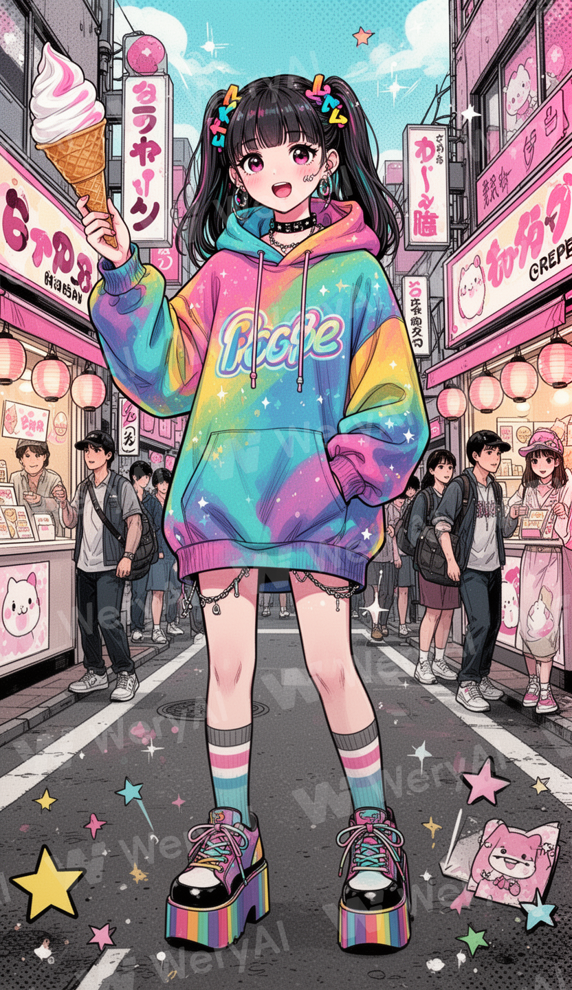 (masterpiece, best quality), modern Japanese street fashion. A cute girl in Harajuku style. Colorful oversized hoodie, platform shoes, rainbow hair clips. Takeshita street background with crepe shops. Pop art style, vibrant colors, energetic, kawaii culture.