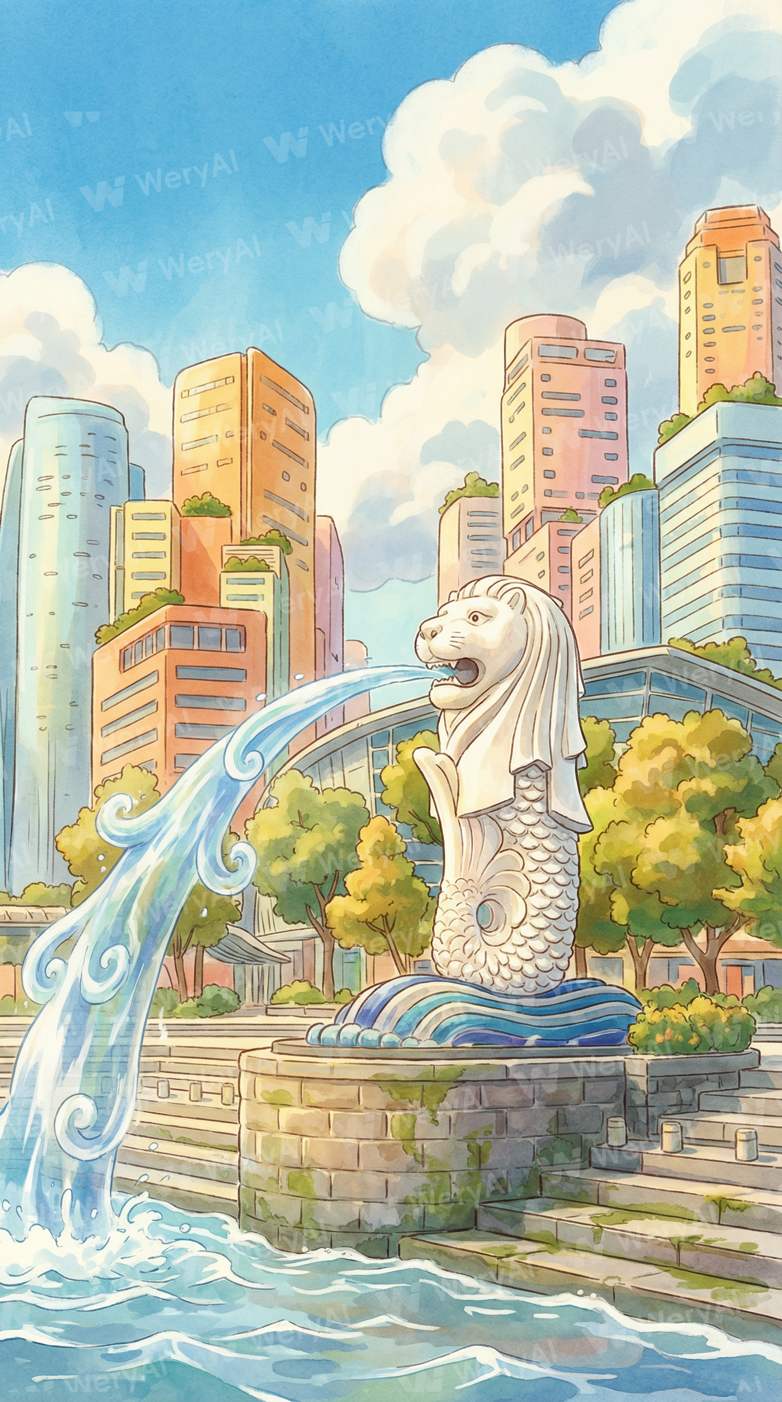 A Studio Ghibli–inspired illustration of a majestic white lion fountain statue spouting water into a bay, set in a lively coastal city. The statue has soft, rounded shapes and hand-painted textures, with flowing water drawn in an expressive, magical style. Surrounding the fountain are stone steps, gentle waves, and lush green trees. In the background, tall modern skyscrapers are reimagined with warm pastel colors and simplified, whimsical architecture. Bright blue sky with drifting fluffy clouds, warm daylight, peaceful urban atmosphere. Painterly anime background, watercolor textures, nostalgic and serene mood, highly detailed, cinematic composition, 4k, hand-drawn fantasy cityscape.