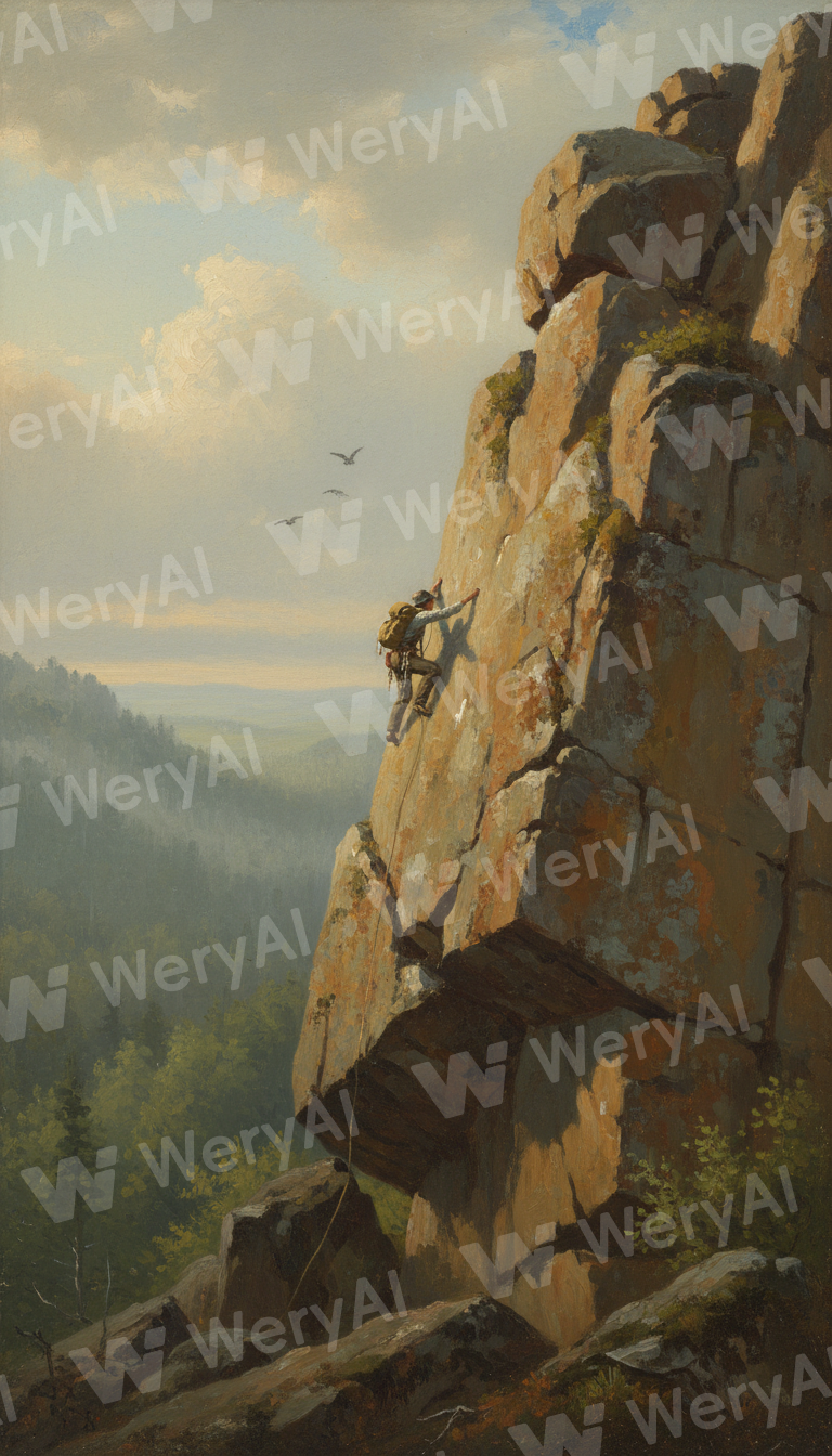 Barbizon School landscape painting style, rock climber ascending massive granite cliff face, soft natural light filtering through forest canopy below, Jean-Baptiste-Camille Corot atmosphere with silvery grey-green tonality, romantic but grounded naturalism, figure small against immense rock formation, warm ochre and sienna stone colors with cool shadow recesses, detailed lichen and moss textures on rock surface, valley forest visible in misty distance, en plein air painting quality with loose confident brushwork, celebration of direct nature observation, dawn or dusk soft lighting avoiding harsh contrast, authentic climbing position with dynamic reach, chalk marks on rock adding human trace, birds circling at eye level, clouds soft and luminous, French 19th century pastoral translated to vertical wilderness, oil paint texture visible, atmospheric perspective creating depth