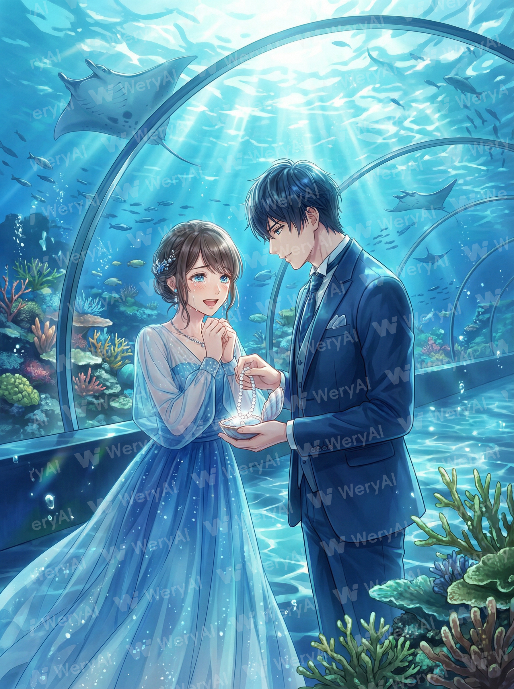 Otome game CG illustration, exquisitely beautiful, inside a massive underwater glass tunnel. Sunlight filters through the seawater, casting dynamic water ripples and light patterns (caustics). A couple: the male lead, wearing an elegant deep-sea blue formal suit, is taking a glowing pearl necklace out of a seashell box to present to the female lead; the female lead is wearing an aqua-blue gradient tulle dress, her expression filled with surprise and emotion. Outside the glass are colorful coral reefs, schools of fish, and a giant manta ray. Dreamy atmosphere, translucency, high detail, intricate clothing details, character close-up, facial expression close-up. 8k resolution. The scene features subtle hints of green and brown.