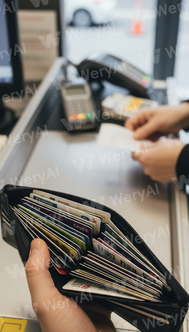 The gaze is directed into an open wallet, which is packed full of various point cards and membership cards.