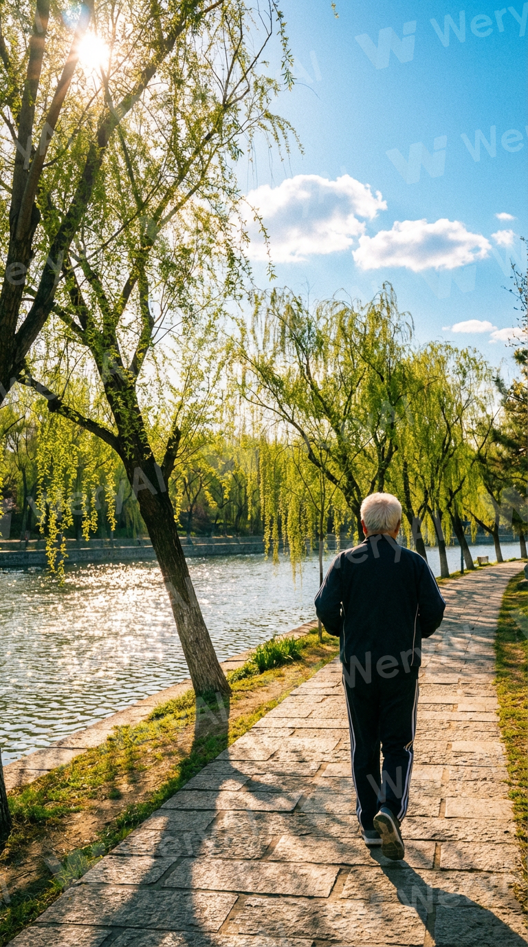 Riverside park in the early morning. Sunlight gently spilling onto the cobblestone path. The back view of a white-haired but spirited elderly man in comfortable sportswear, jogging slowly. Beside him is the shimmering river water. Willow trees on the bank are sprouting tender green branches. The sky is deep blue with a few drifting white clouds. The overall image is bright and clear, with warm and fresh tones, full of positive energy and vitality. Realistic style, rich in detail, high resolution.