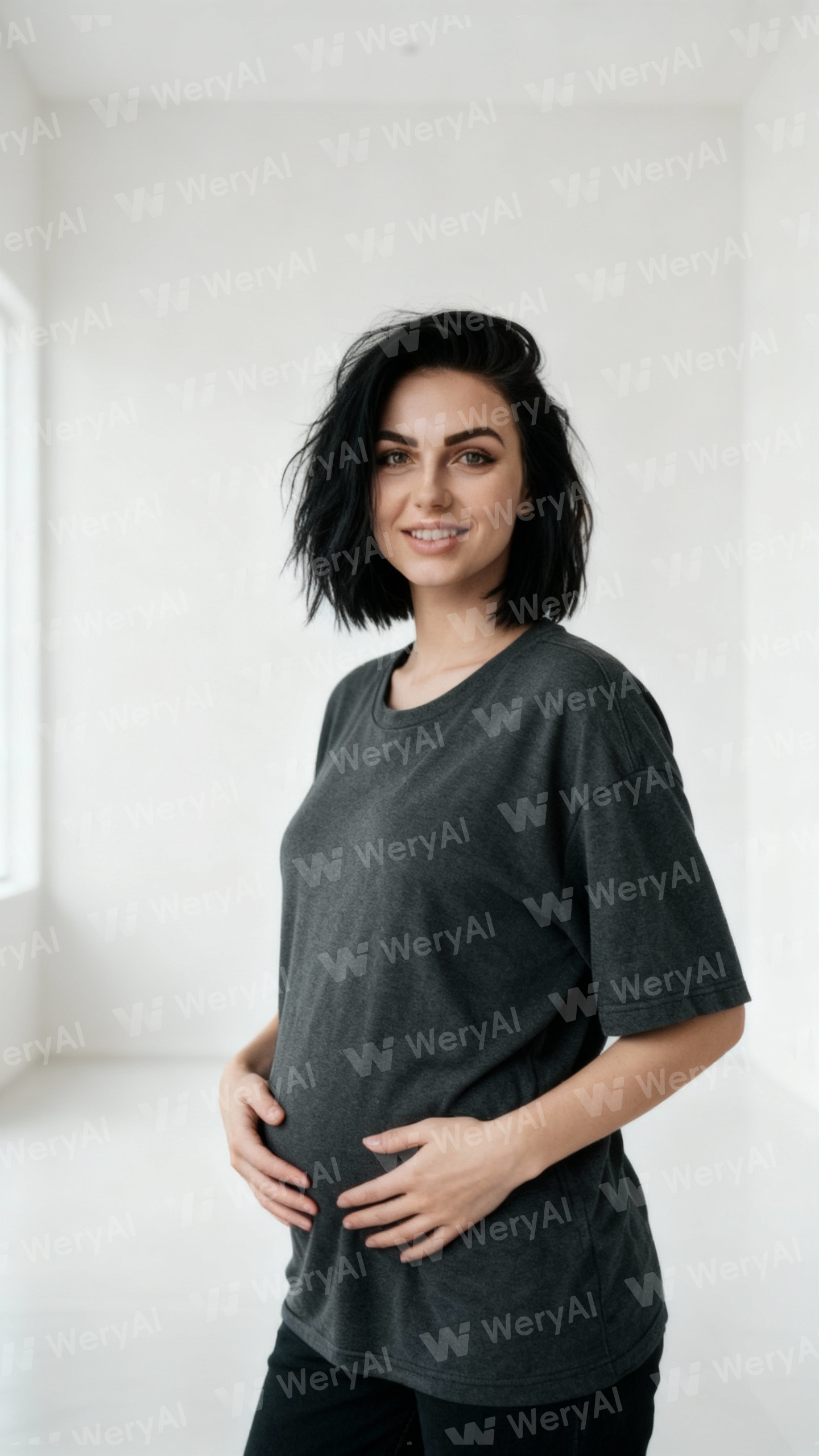 [Hair] Keep the hairstyle and hair color from the character; do not change style, length, or color. [Clothes] Preserve the character's clothes. [Pose & Hands] Slightly angled 3/4 view facing the camera in a relaxed full-body pose. Both hands rest gently on the character's lower abdomen. [Camera] Fixed waist-level height, straight-on angle, framing centered on hips and waist with slight headroom. [Environment & Lighting] **Completely empty room**, Minimalist modern indoor room, off-white walls, soft daylight. Subtle shadows, Symmetrical soft lighting, shallow depth of field. Remains simple, uncluttered, blank. [Face] Perfect balanced features, flawless smooth skin, clean fine pores, refined nose and lips, natural soft expression. [Eyes & Skin] Eyes: natural dark irises, pure-black pupils, no glow. Skin: healthy, natural tone consistent with the reference image, no over-smoothing. [Quality & Style] Masterpiece, best quality, ultra-realistic, 8k UHD, photorealistic live-action.