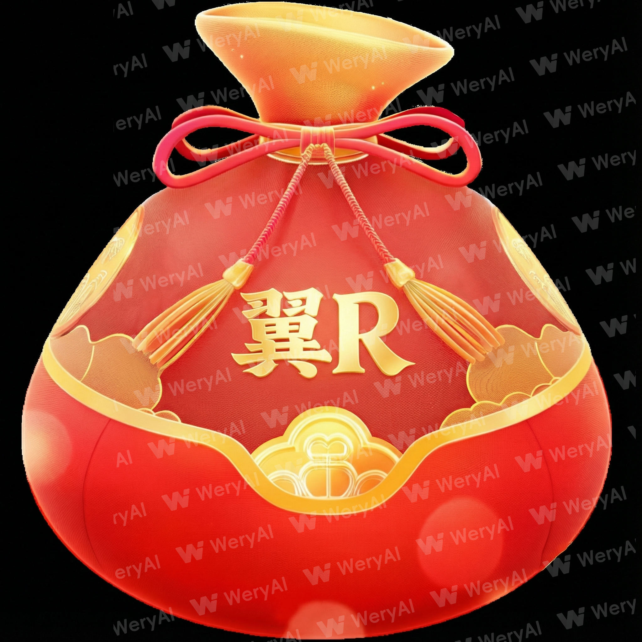 Add the text "翼R" (slightly larger) to the center of the money bag decoration in Figure 1, referencing the text style in Figure 2. Ensure the text style blends naturally with the decoration, against a pure black background.