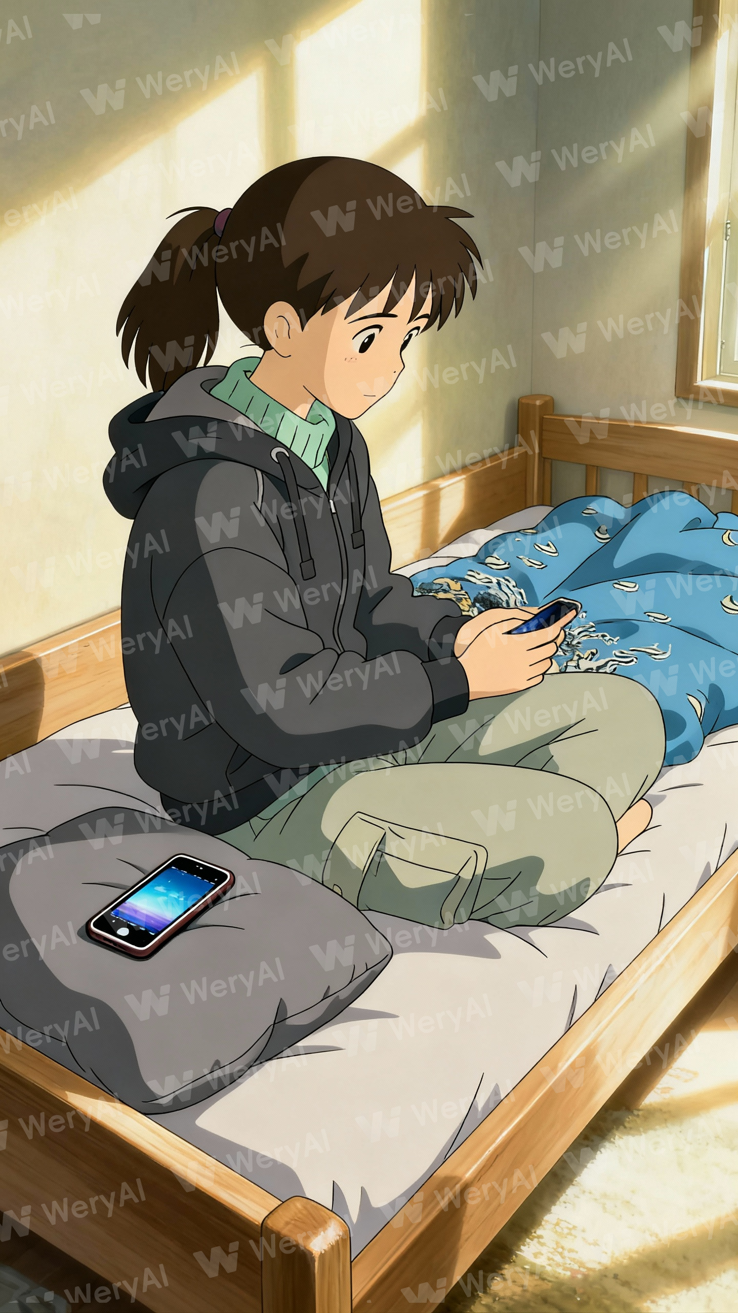 Studio Ghibli, the young woman with a ponytail, sitting on a bed, holding a smartphone, casual hoodie, cargo pants, smartphone on grey pillow, cozy sunlit bedroom, side angle shot, soft lighting, peaceful ambiance, masterpiece, best quality, ultra-detailed, cinematic quality