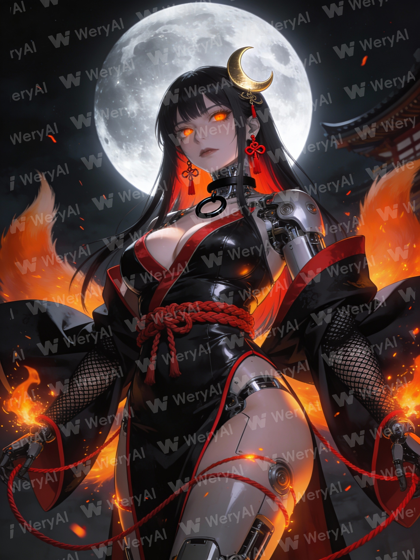 Decorations: Golden crescent moon hair ornament, red knotted earrings, black ring choker. Surrounded by flickering orange-red fox-fire particles. Intricate red ropes outline body lines and firmness.