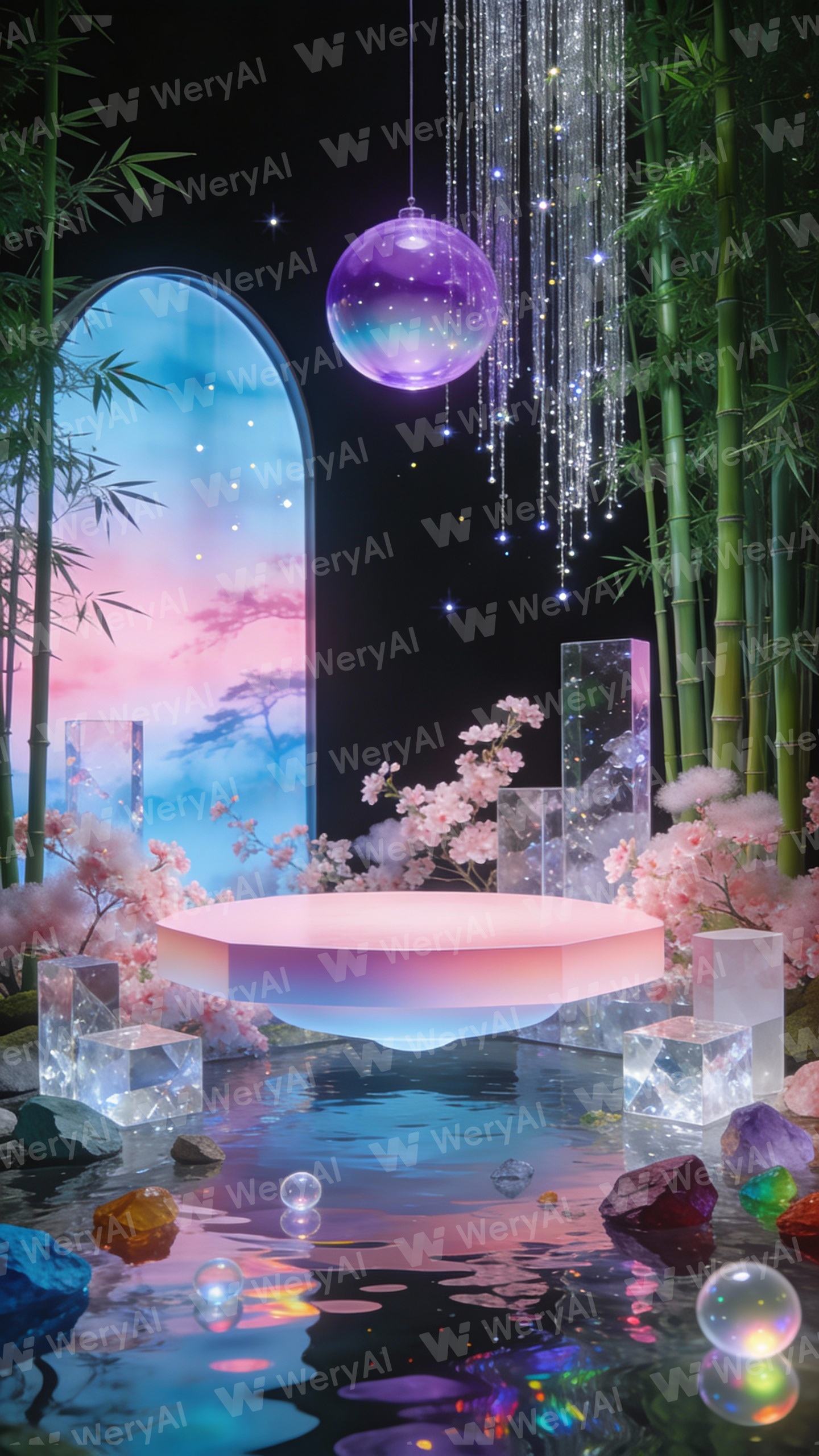 An immersive stage installation blending Oriental Zen with a cyber-dreamlike aesthetic. At the center is a light pink gradient floating platform, surrounded by deep green artificial bamboo forests, misty pink cherry blossom clusters, and geometric blocks with transparent acrylic and crystal textures. Suspended from the top is a purple gradient translucent planetary installation and draped silver silk thread curtains, dotted with delicate starlight. Against a pure black background, an arched semi-transparent screen on the left projects pink and blue gradient nature imagery. The foreground water surface reflects kaleidoscopic light and shadows, scattered with colorful ores and glowing transparent bubbles. The overall atmosphere is ethereal and dreamlike, with a color palette dominated by pink, green, blue, and purple. The collision of materials creates rich layers of transparency, reflectivity, and botanical textures, combining Oriental artistic conception with futuristic aesthetics.