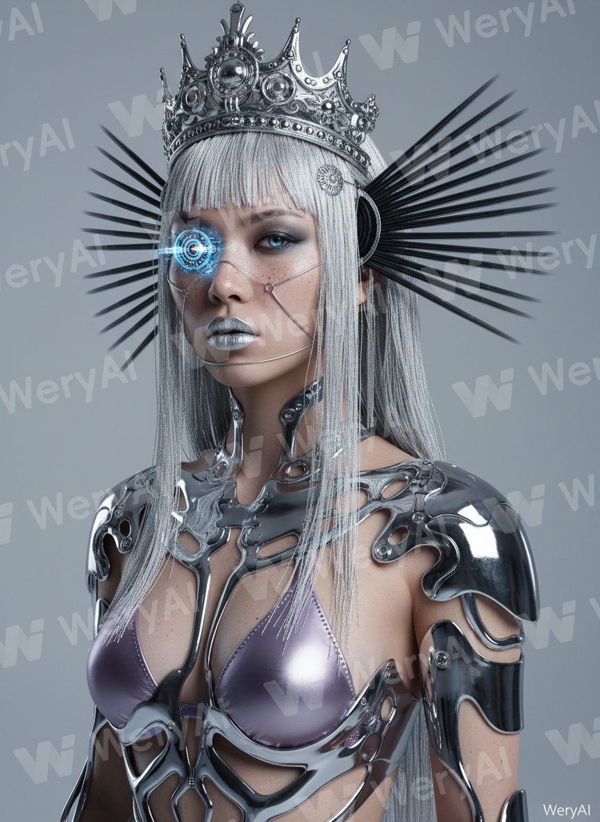 Subject: Asian teenage girl with a cold, aloof expression; her left eye is a mechanical eye; steampunk hair accessories; skin features subsurface scattering with subtle freckles; high-gloss lip glaze; silver vertical hair strands are distinct and sharp. Clothing: Pink-purple metallic bikini covered with high-reflectivity liquid chrome outer armor, showcasing complex streamlined cutouts and mechanical structures. Decorations: Silver Baroque futurist crown; face encircled by delicate metal wire restraints; black radial comb-like components with motion blur effects on the sides of the head. Background: Minimalist high-key gray studio space; vacuum-clean composition; emphasizing the subject's sense of isolation. Copy: Light gray miniature WeryAI English font in the bottom right corner. Style: 85mm lens perspective; strong metallic refraction and anisotropic filtering effects; cool-toned global illumination; Octane render quality of top-tier commercial photography.