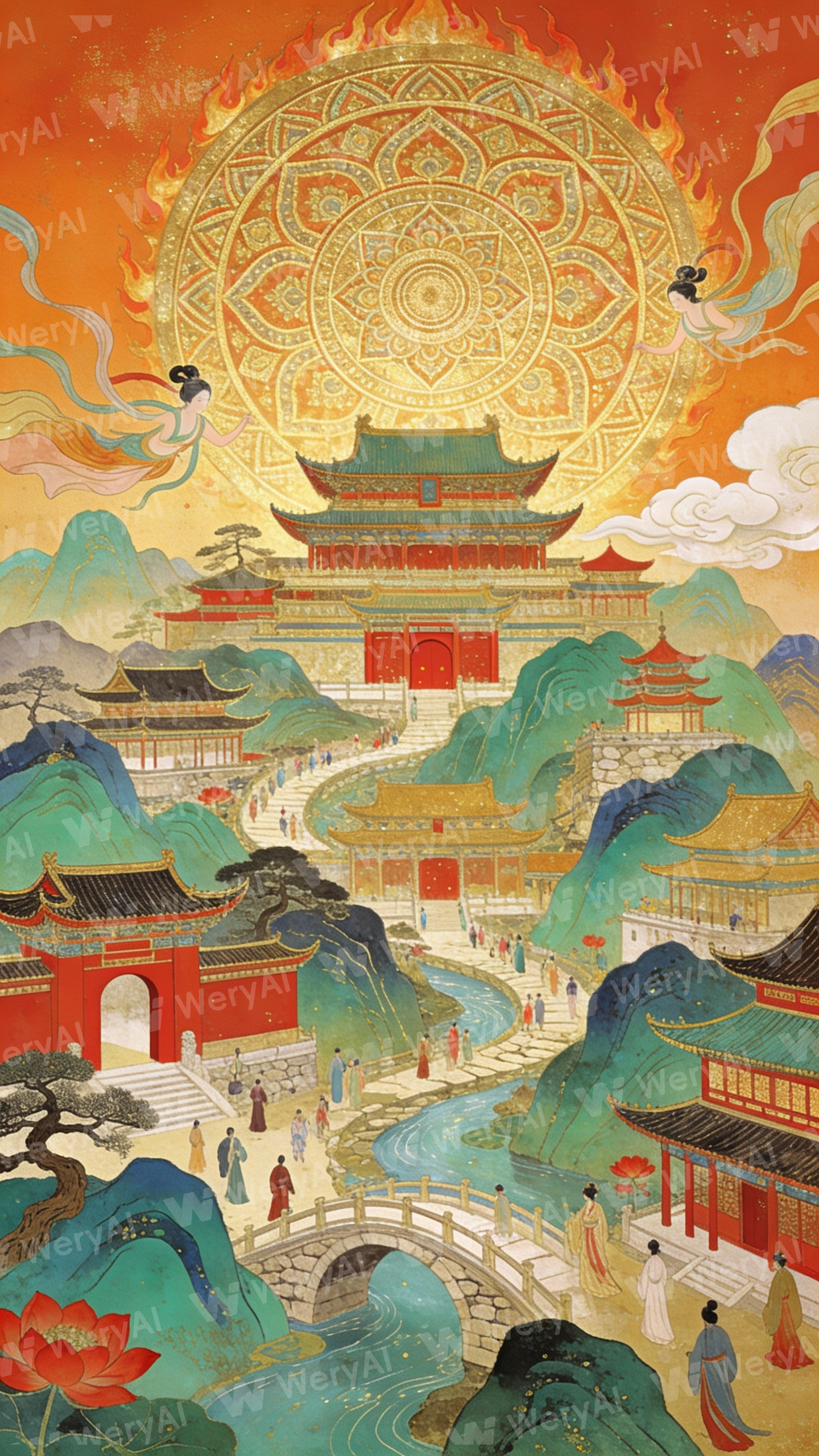 This is a 'New Chinese Heavy Color' and 'Mineral Pigment' style long scroll depicting a prosperous celestial capital. The overall palette is dominated by gold, orange, red, and turquoise, blending the opulent texture of traditional murals with the rich layering of modern illustration. At the center of the composition are layered clusters of ancient Chinese architecture, including palaces with double-eave hip-and-gable roofs, pavilions with flying eaves, and vermilion gate towers, scattered amidst overlapping turquoise mountain peaks. Winding rivers and stone bridges connect the streets and alleys, where crowds dressed in Hanfu bustle about, imbuing the scene with the vibrant energy of a prosperous era. In the sky hangs a massive golden mandala-style circular wheel, filled with intricate geometric patterns and flame textures, surrounded by flying Apsaras with flowing ribbons. Auspicious clouds, exotic flowers (such as red lotuses), and ancient trees are interspersed throughout. The overall linework is fine and intricate, the colors are highly saturated and richly layered, and the atmosphere is magnificent, dreamlike, and ethereal.