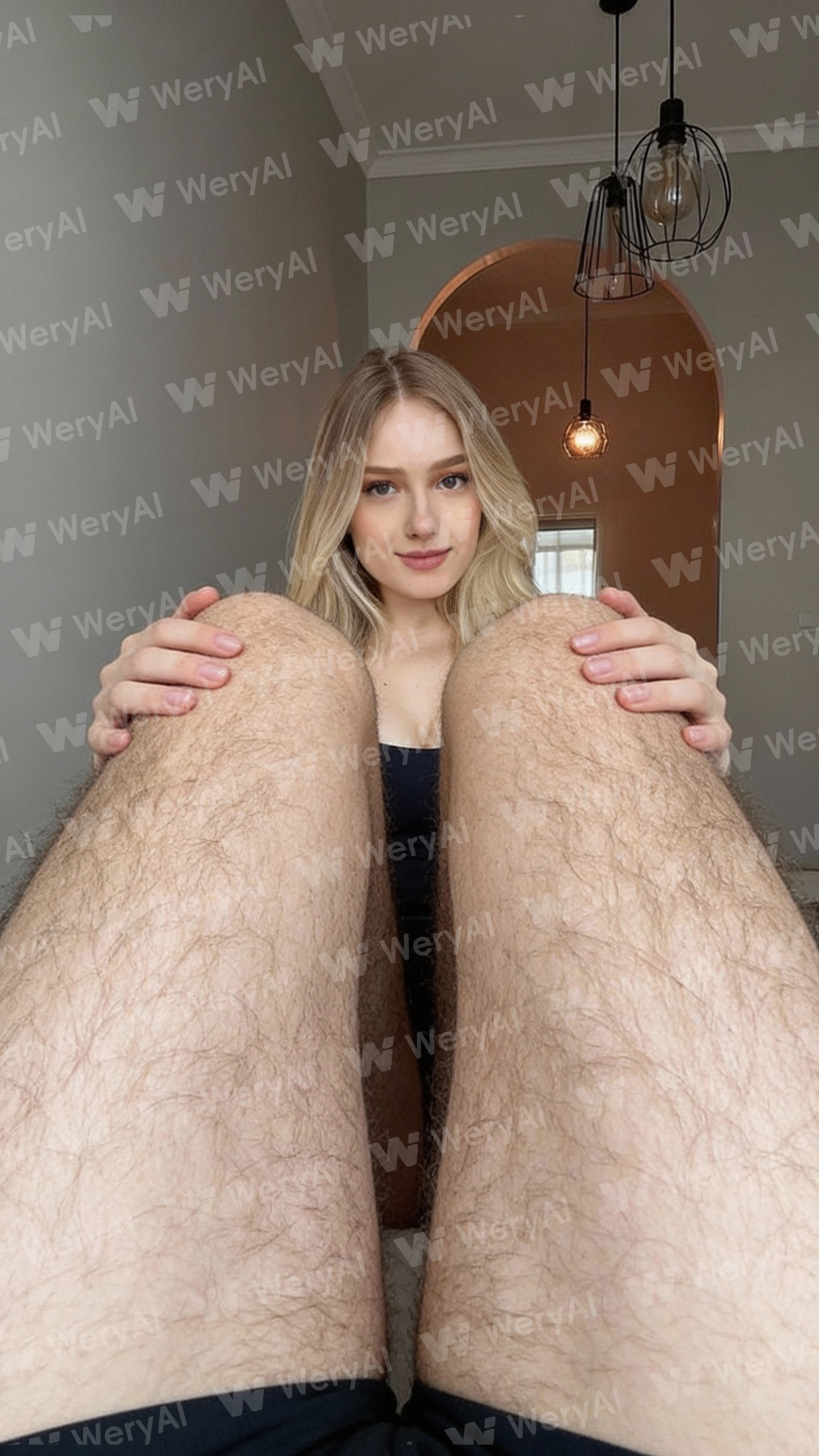 A first-person perspective (POV) of a sitting man taking a photo. The man's thighs are spread apart, and a woman's hands are caressing his hairy thighs. Only the man's thighs are visible in the shot.