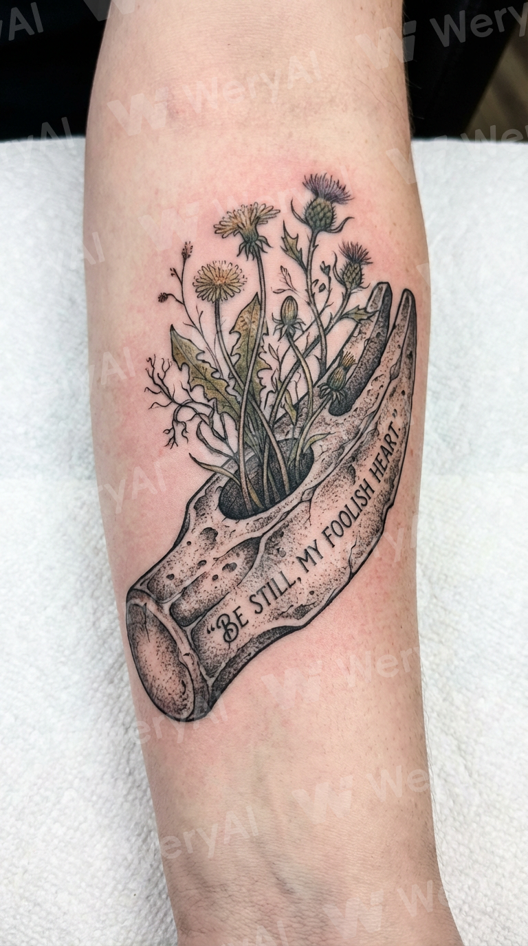 Tattoo: An upside-down hammer head, the wooden handle removed, leaving the empty socket open. From that hollow, small wild blossoms and weeds sprout upward—humble, persistent growth, like plants pushing through concrete. The metal is lightly pitted with age; the bloom understated, not pretty. Quotes: “Be still, my foolish heart.” (engraved, along the inner curve of the hammer head)