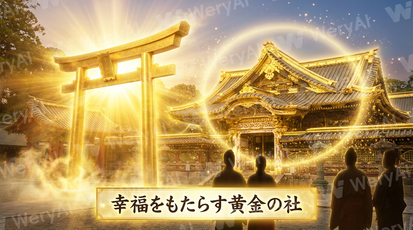 A mystical Japanese Shinto shrine glowing intensely in brilliant gold, enveloped in an ethereal golden light. The torii gate and shrine structures emit a divine radiance, with magical golden mist drifting around. The atmosphere is sacred, mesmerizing, and supernatural, reminiscent of dawn or dusk with soft, enchanting light. Designed for a fortune-bringing, eye-catching advertisement; ultra high-resolution, dazzling with ornate details, the entire scene bathed in mysterious, shimmering gold.