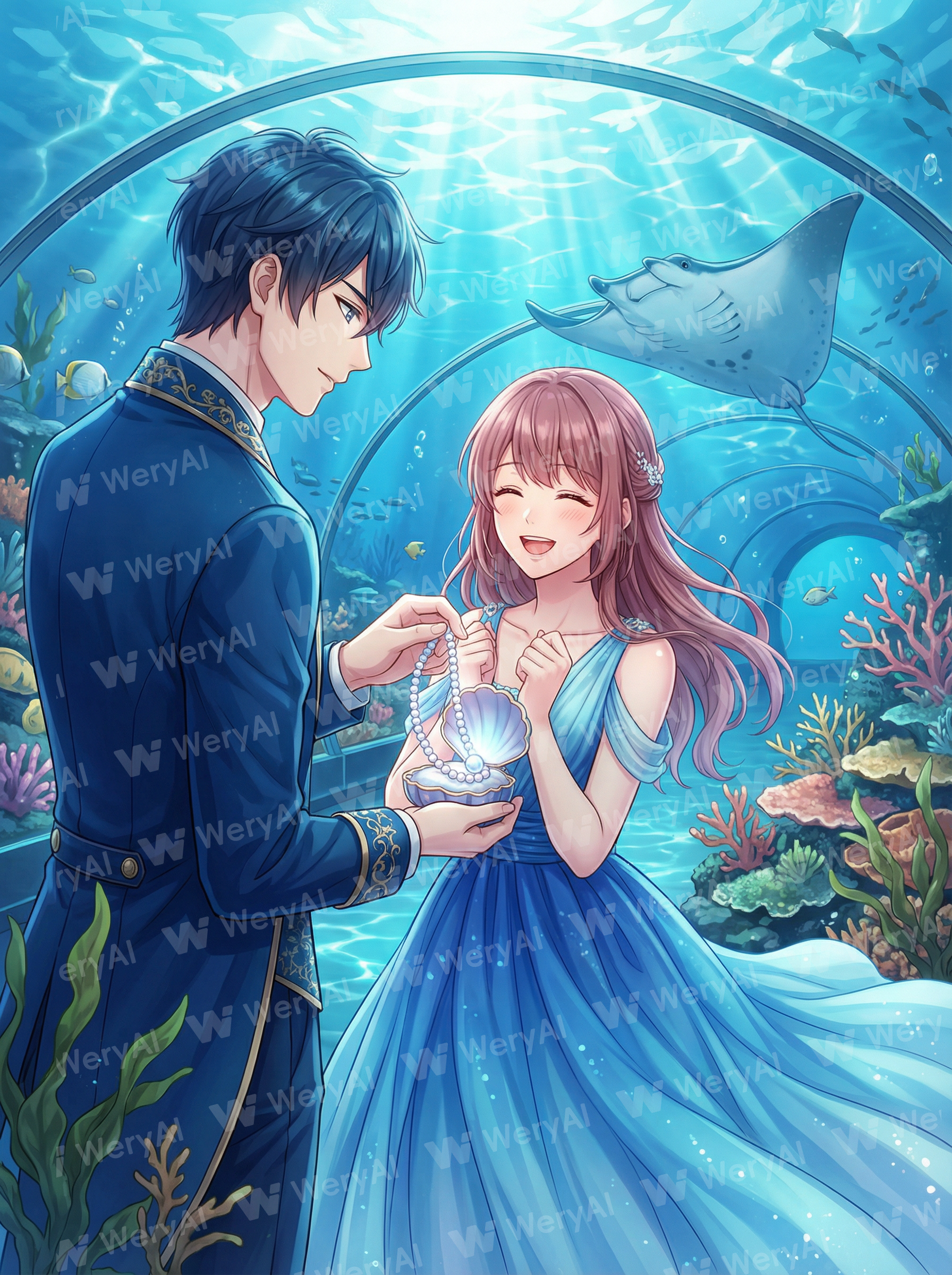 Otome game CG illustration, exquisitely beautiful, inside a massive underwater glass tunnel. Sunlight filters through the seawater, casting dynamic water ripple light patterns (caustics). A couple: the male lead, wearing an elegant deep-sea blue formal suit, is taking a glowing pearl necklace out of a shell box to present to the female lead; the female lead is wearing a water-blue gradient tulle dress, has pinkish-brown hair, and wears a happy expression. Outside the glass are colorful coral reefs, schools of fish, and a giant manta ray. Dreamy atmosphere, transparency, high detail, clothing details, character close-up, facial expression close-up. 8k resolution. The image has subtle tints of green and brown.