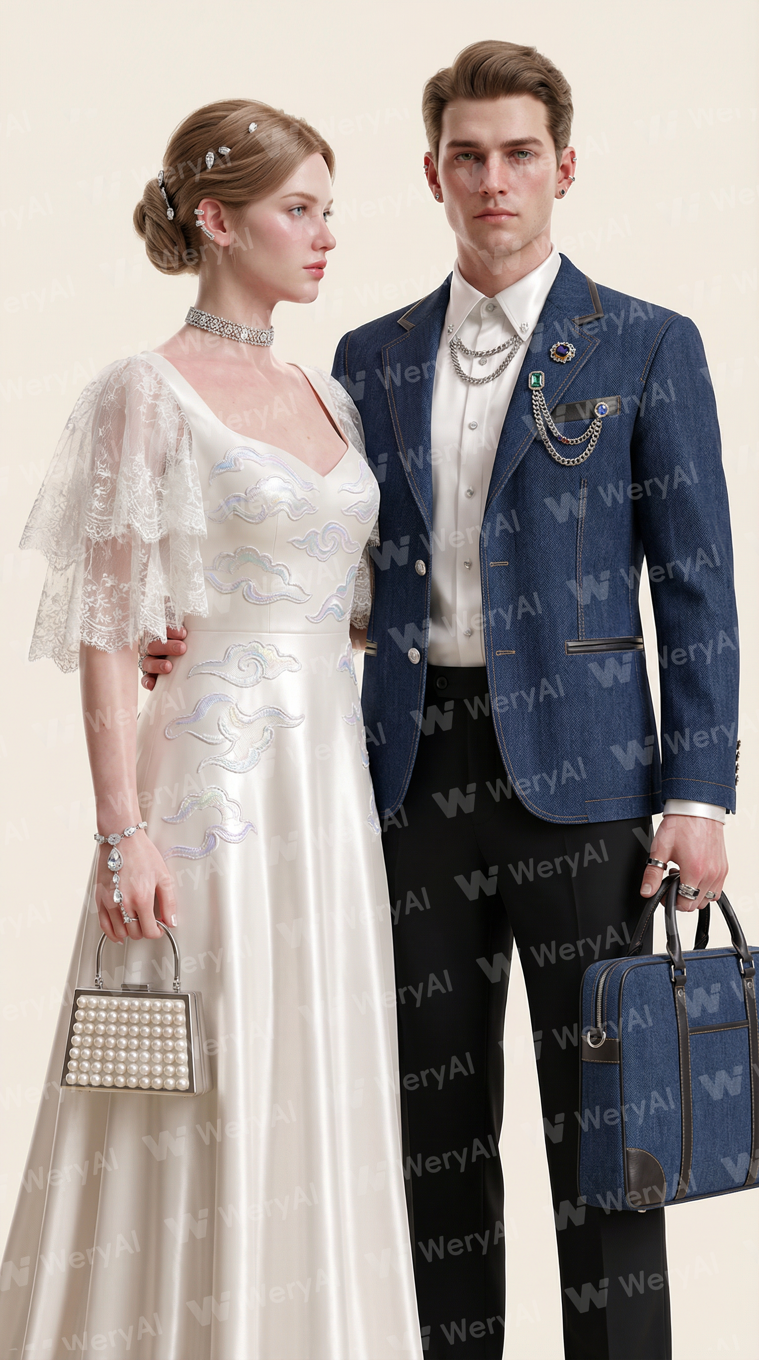 I want to create a couple image show for a celebrity stage event. The theme should be stage fashion, with a youthful, fresh, and trendy style. The designs should feature masterpiece runway outfits and haute couture jewelry, drawing inspiration from the haute couture styles of Miracle Nikki and the fashion aesthetics of QQ Dance. Incorporate Pop Mart's design language but applied to adult supermodel proportions. Provide detailed descriptions of character features and attire. The skin should feature a Subsurface Scattering (SSS) effect, presenting a translucent waxy or premium silicone texture. The materials should be a blend of clay and hyper-realistic fabrics (such as silk reflections, metallic luster, and denim textures). Rendered in Octane with a solid color background.