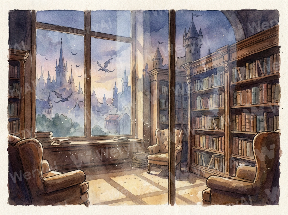 I want to depict a scene looking out from inside a library. The style is European, and a faint medieval fantasy landscape is visible through the window. In a nostalgic illustration style.