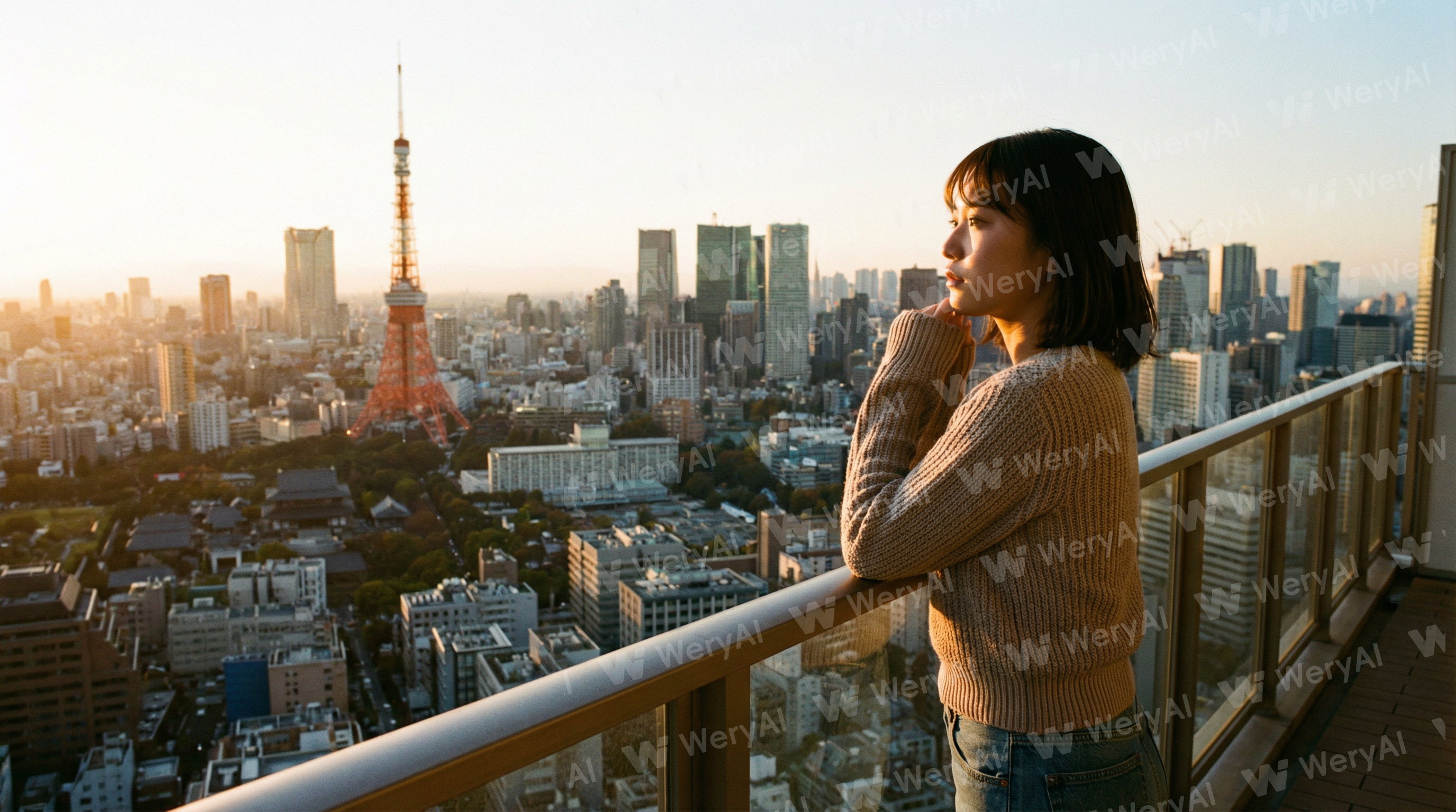 Cinematic medium shot realistic photography, a 20-year-old Japanese woman on a Tokyo balcony, bathed in the golden hour light, with a contemplative expression, set against a backdrop of a magnificent sunset over a bustling city, capturing urban romance and dreams.