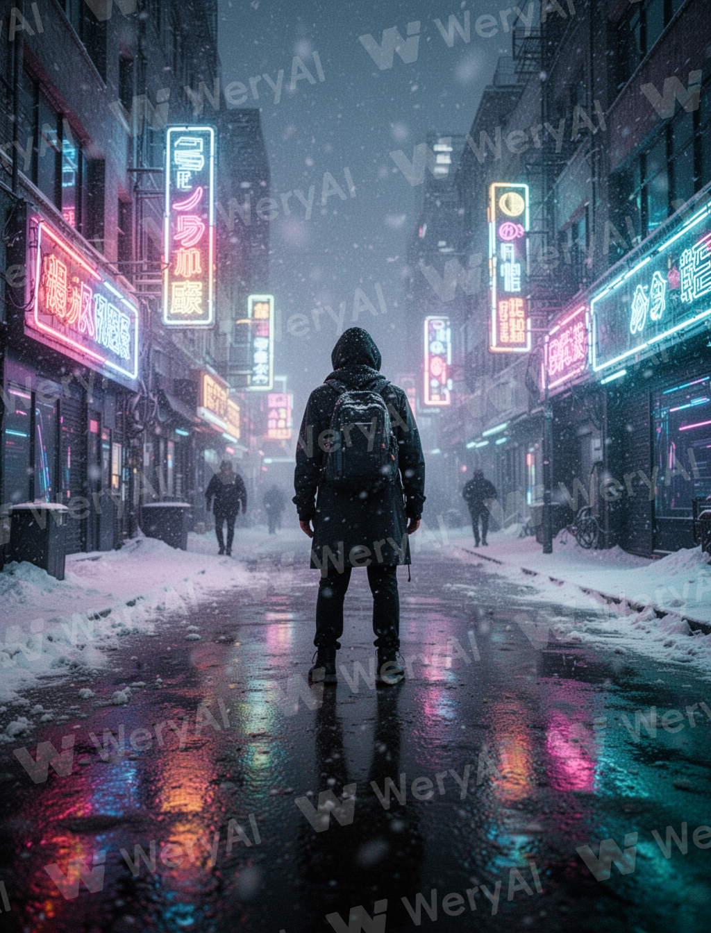 Urban snowfall portrait, neon lights reflected on wet ground, cyberpunk color scheme, dramatic lighting, cinematic street scene, soft snow particles, glowing signs, 35mm lens, cool tone.