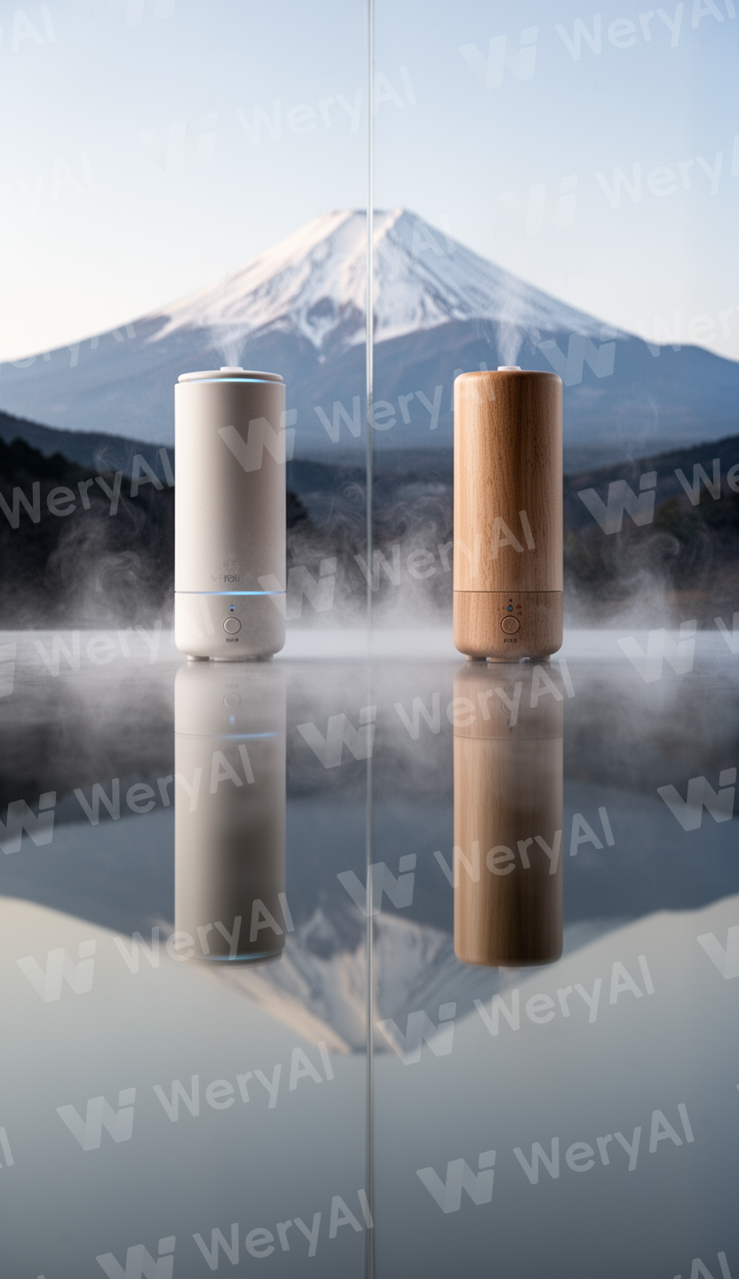 Two cylindrical aroma diffusers placed vertically on a central axis. The top product is upright. The bottom product is also upright, but appears as a soft reflection, slightly faded and blurred, like a reflection on water. Both products face each other, creating a calm symmetrical composition. A subtle mist layer separates them at the center. Inspired by Mount Fuji reflection imagery. Minimal, Japanese aesthetic, premium and quiet. No text, no logo.