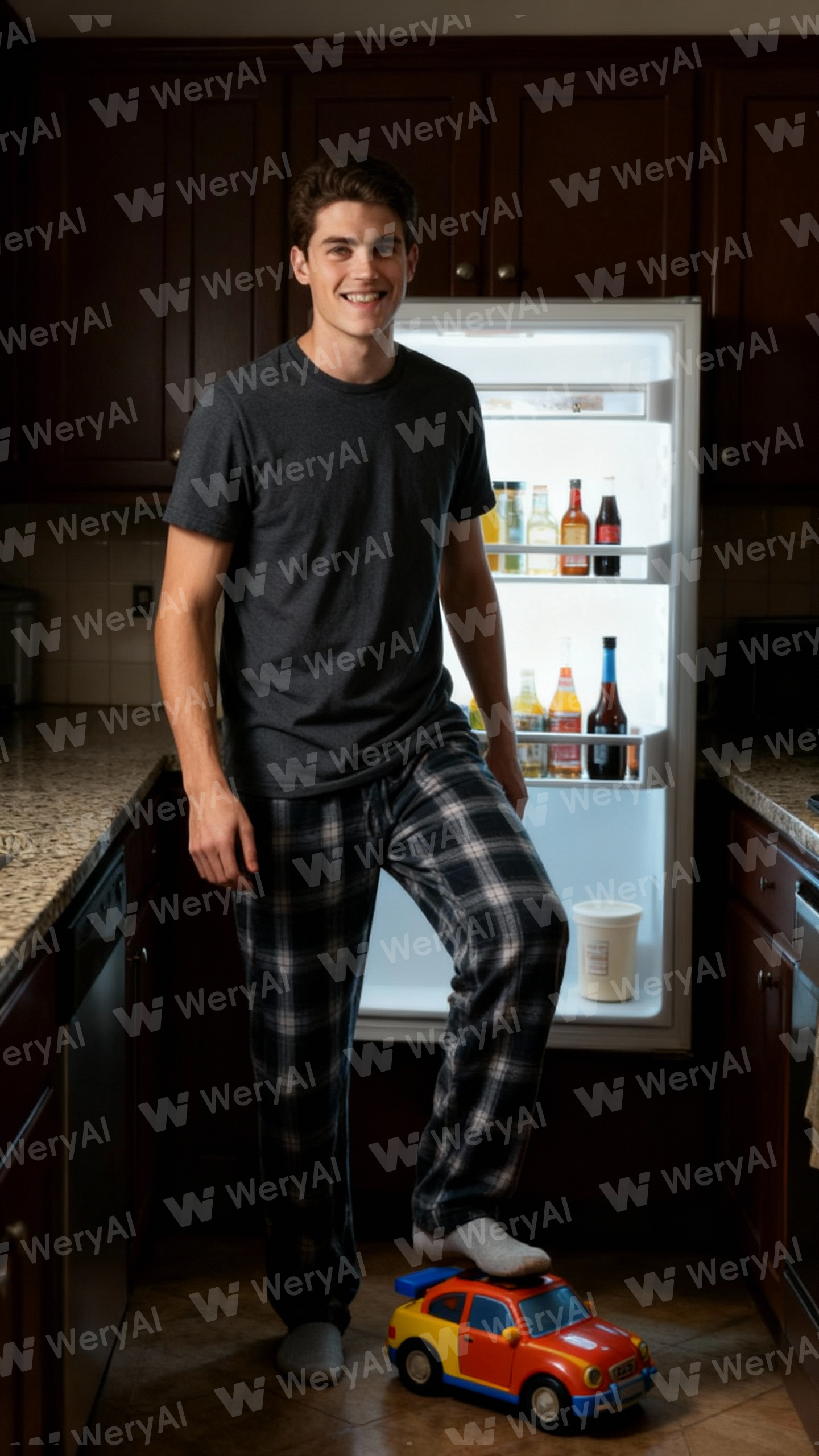 photorealistic, medium shot, Noah in a t-shirt and pajama pants, standing with foot over toy car, mischievous expression, lit kitchen, masterpiece, best quality, ultra-detailed, correct anatomy, proper body proportions, perfect hands, no extra hands, no bad anatomy, no misplaced nipples, no extra nipples, no exposed nipples, no side breast visible, no exposed genitals, no pussy, no vaginal exposure