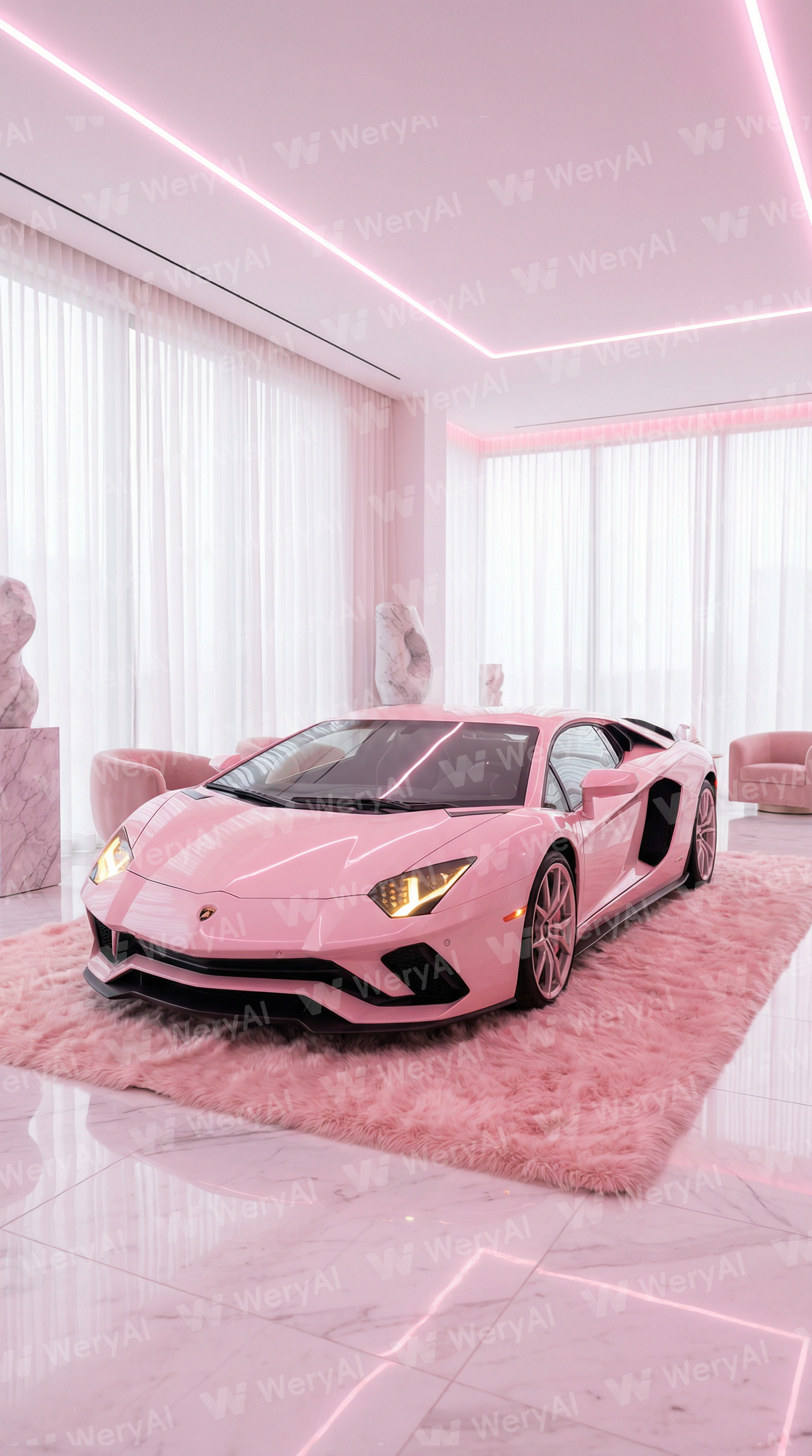 Ultra-luxury aesthetic scene of a pastel pink Lamborghini Aventador parked indoors on a fluffy pink rug, glossy baby-pink paint finish, sharp modern supercar design, LED headlights on, cinematic soft pink ambient lighting, minimalist luxury interior space with white curtains, marble floor reflections, pink neon ceiling lights, dreamy high-fashion vibe, Instagram aesthetic, clean composition, wide-angle lens, ultra-realistic, 8K, high detail, smooth reflections, modern opulence, editorial photography style