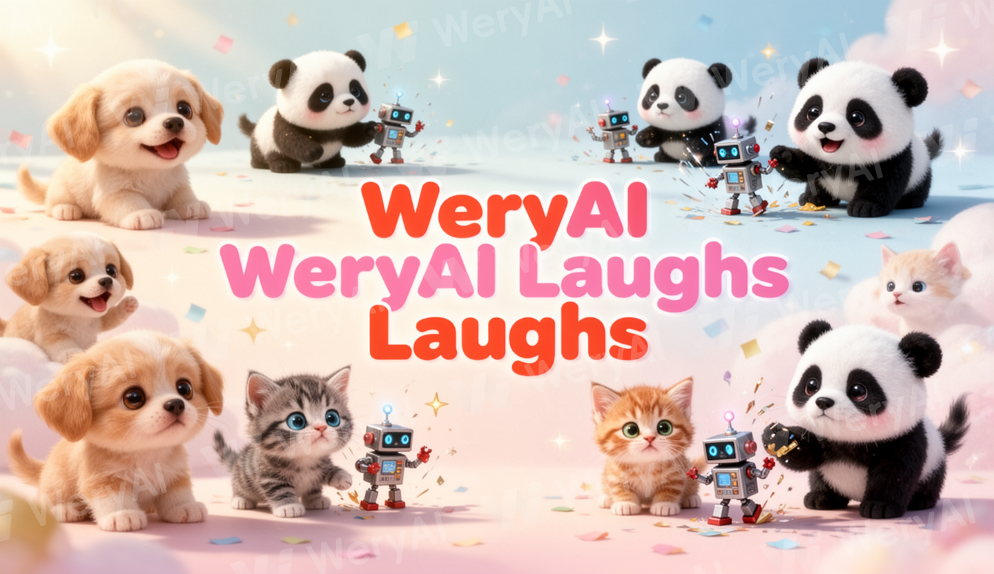A bright, cheerful digital banner showing a collection of adorable AI-generated animals and tiny funny characters: playful puppies, baby pandas, curious kittens, and tiny robots causing cute chaos. Soft pastel background with floating sparkles and confetti. Include bold, friendly text in the center: ‘WeryAI Laughs’ in playful, rounded font. Sunlight and soft shadows for a warm, happy mood. Style: cute, funny, whimsical, high-quality, Instagram/YouTube aesthetic.