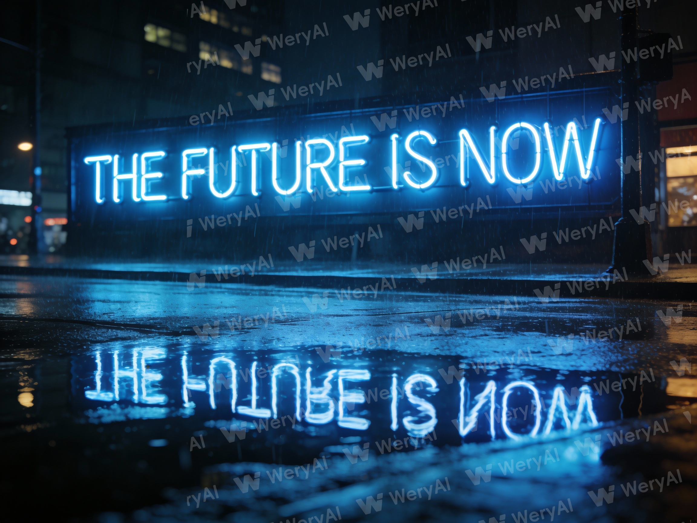 A photograph of a neon sign flickering on a street on a rainy night. The sign clearly displays the English words "The future is now", with the neon lights reflecting on the wet pavement.
