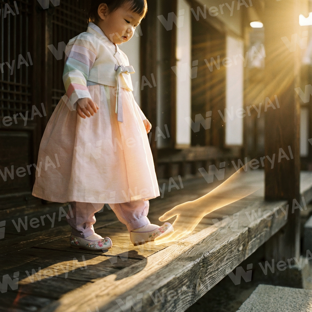 A heartwarming, cinematic photograph taken during golden hour. A toddler (approx. 2 years old) wearing a beautifully modernized pastel Hanbok and new Seollal shoes is taking a tentative step on an old wooden veranda (maru). The focus is sharp on the child's feet and the shoes. A soft, glowing, ethereal golden light formation, distinctively shaped like a caring mother's protective hand, is gently enveloping and touching the child's shoes, emitting warmth. Intense, warm golden sunlight rays pierce through the scene, illuminating the child and dust motes in the air. The surrounding traditional Korean Hanok background is deeply shadowed, dark, and significantly blurred (heavy bokeh), emphasizing the central subject and the magical glowing hand. Film grain texture, emotional atmosphere, richly detailed textures of fabric and wood.