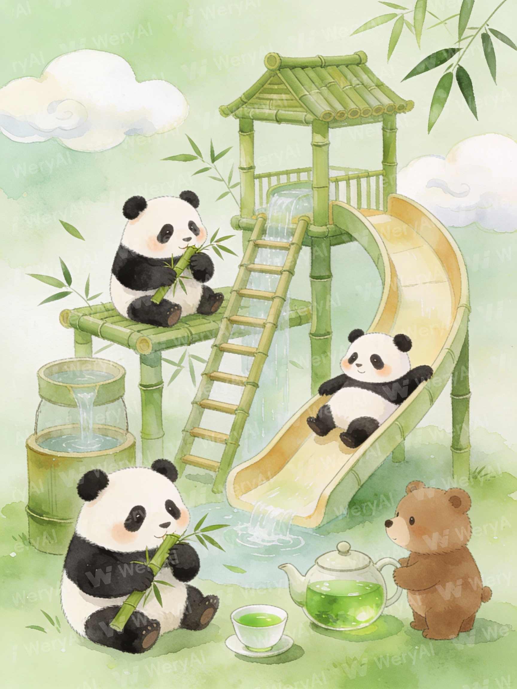 Cartoon pandas (several of them, some eating bamboo, some on slides, some making tea), bamboo structures (water stairways, containers), a little brown bear, teapots and teacups (filled with a green liquid), clouds and bamboo leaves, all in a light green palette with a watercolor texture. The overall scene is soothing and cute, full of fresh, fairytale-like charm and childlike playfulness.