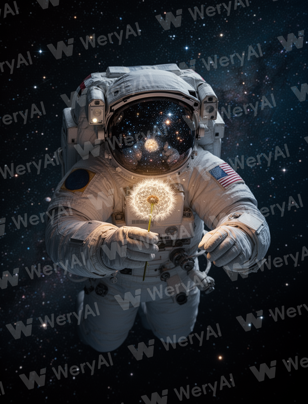 A lone astronaut drifting in space, holding a glowing dandelion, stars reflected in the visor. Poetic, cinematic.