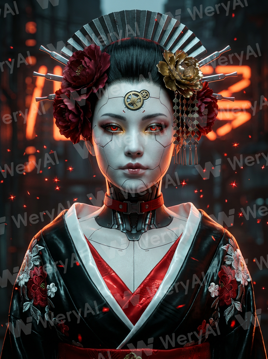 Subject: Cyberpunk manga-style mature geisha, porcelain-white mechanical skin adorned with fine weld seams—the seams must be delicate—cold red electronic pupils with a metallic texture, and ergonomic mechanical structures fitted to the neck. Heavy and gorgeous makeup highlighting superior facial features. Pale amber shimmering irises, red high-density mechanical neck collar. Clothing: Layered black and white silk kimono with exquisite red and white floral embroidery, the fabric has a warm luster and distinct edge folds, with bright red underskirt details peeking through. Decorations: Fan-shaped mechanical hair accessories adorned with large dark red faux silk flowers, surrounded by floating spark-like red particles, with metal hairpins exhibiting a cold reflective luster. Also featuring heavy metal craft gold peony hairpins with swaying metal pendants, and miniature brass linkage gears embedded in the center of the forehead. Background: A deep industrial cityscape where well-arranged orange-red neon lights create a beautiful bokeh, full of technological decay and a cold near-future atmosphere. Style: Cinematic portrait composition, 85mm prime lens, rim lighting and Tyndall effect outlining the silhouette, subsurface scattering (SSS) representing porcelain skin texture, and extreme ambient occlusion rendering.