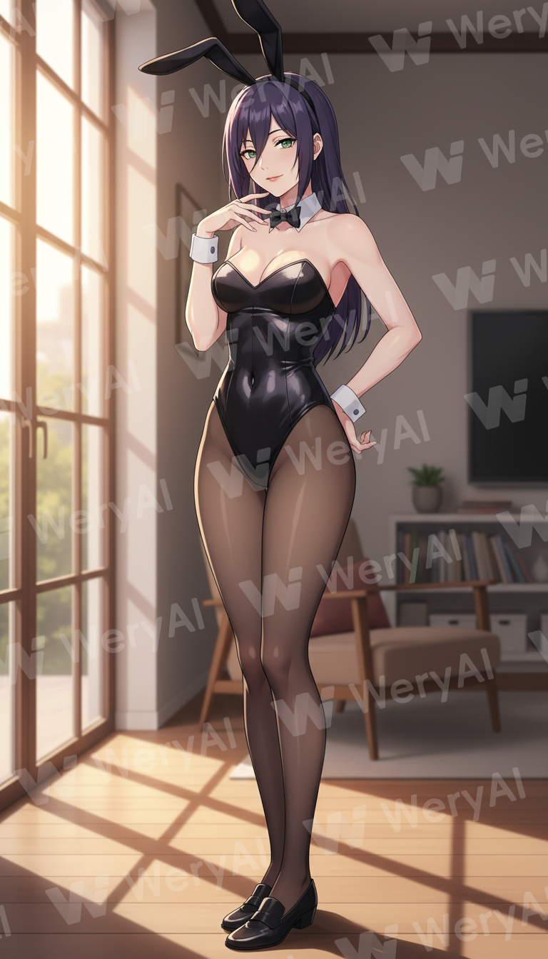 Anime-style illustration of Reze from Chainsaw Man wearing a glossy black bunny suit with a strapless design, sheer tights, and matching bunny ears. She has long dark hair styled neatly, striking eyes, and a confident yet playful expression. Her pose is elegant and slightly flirtatious, emphasizing a slim, curvy figure. Warm sunlight streams through large windows in a cozy modern room, creating soft highlights and realistic shadows. High detail, polished anime rendering, smooth skin shading, vibrant colors, and professional character illustration quality.