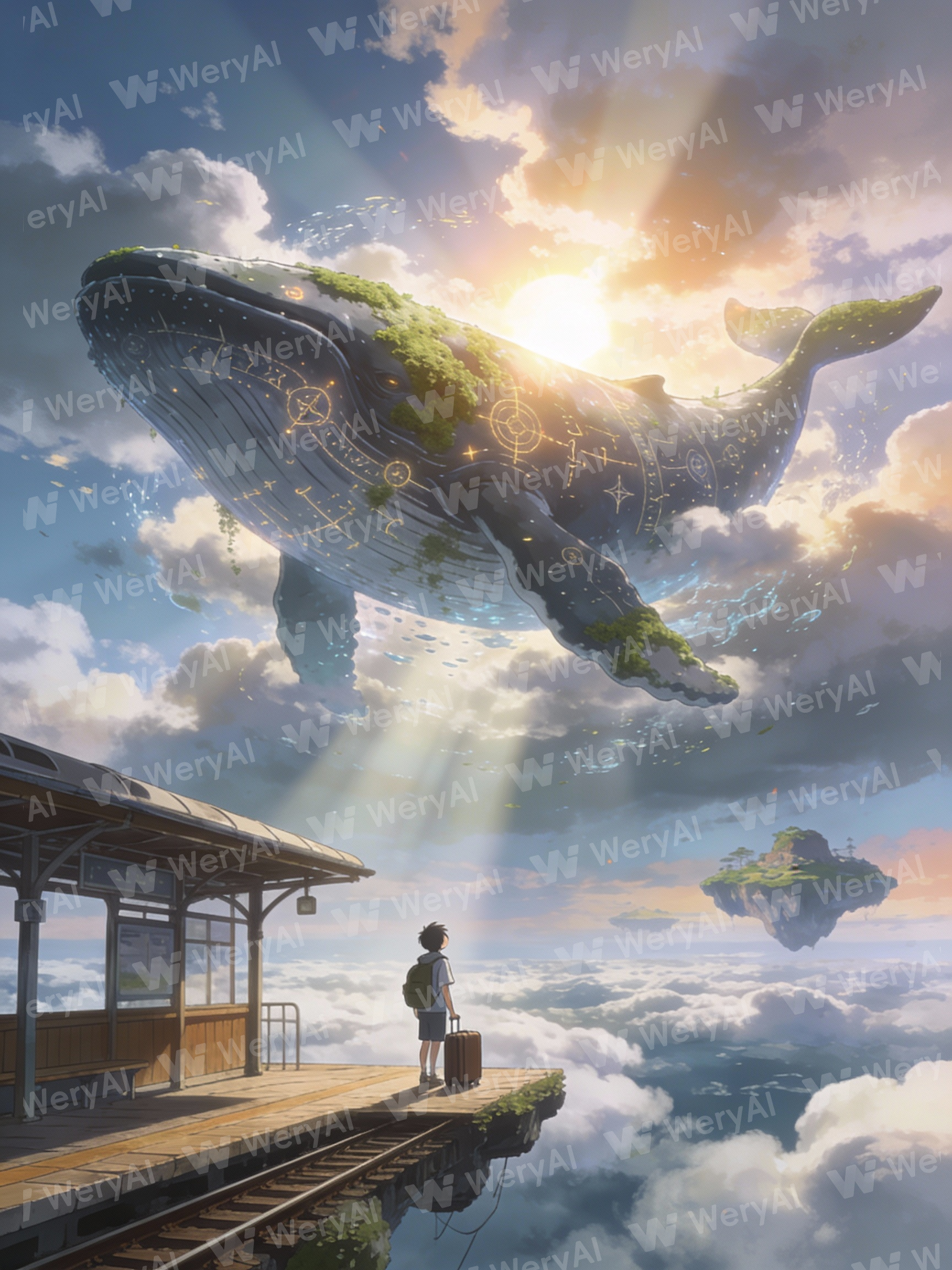 masterpiece, best quality, ultra-detailed, majestic fantasy anime illustration, (Narrative Core:1.3) young traveler boy with suitcase standing on isolated wooden train station platform floating above sea of clouds, looking up in awe at colossal ancient whale with glowing runes and moss swimming overhead blocking the sun, (Art Style & Detail:1.2) Makoto Shinkai style skyscape, incredibly vast scale, majestic god rays (Tyndall effect) piercing through clouds around the whale, floating islands in distance, ethereal and breathtaking atmosphere, (aspect ratio: 3:4)|(worst quality, low quality:1.4), blurry, pixelated, jpeg artifacts, 3d render, realistic style, western cartoon style, bad anatomy, bad hands, missing fingers, extra fingers, text, watermark, signature, monochrome, horror, dark (unless specified)
