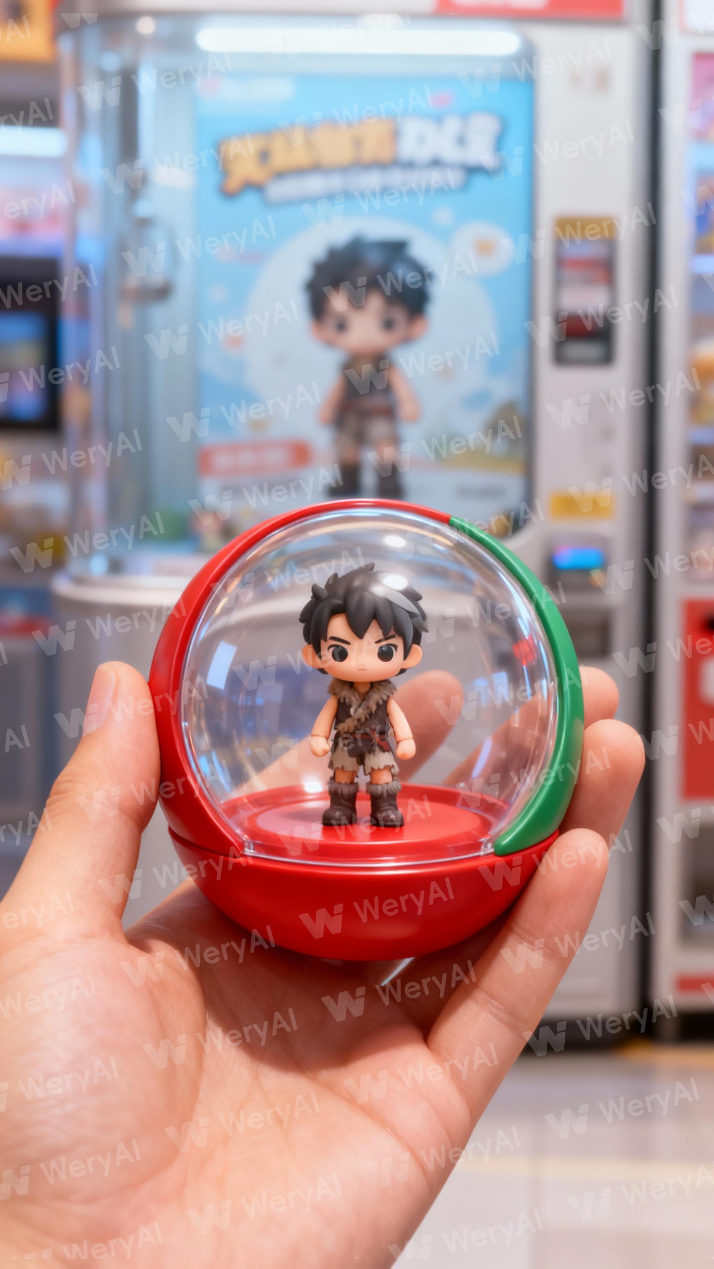 (Masterpiece, best quality, 3D render, Pop Mart style, blind box toy, clay material, C4D:1.4), bright studio lighting. [Central Composition]: A close-up front view of a hand holding a single large (perfectly spherical Gachapon capsule:1.6) in the very center. The capsule is a (perfect geometric circle:1.5), absolutely round, sealed. [Capsule Structure]: The capsule consists of a (transparent clear glass front hemisphere:1.5) and a (solid opaque [Color, etc.: red/green] plastic back hemisphere:1.5). The opaque plastic part is (thick, matte, and completely non-transparent:1.6), hiding anything behind or inside it. The capsule has a (perfectly smooth round curved bottom:1.6) like a ball, sitting directly in the palm, with no stand or flat base attached. [Character Inside]: Inside the transparent area is a (tiny 3D Chibi figurine:1.4) of a [Character/Gender, etc.: girl/boy]. (Full body visible from head to toe:1.6). (Generating legs and shoes to complete the figure:1.5). The figure is (shrunk to fit completely inside:1.4), surrounded by empty space within the glass ball, not touching the walls. (Important details: s/he is wearing [Clothing details, etc.: a black t-shirt and blue jeans], keeping the exact same outfit design as original photo:1.5). (Keeping the exact same hairstyle and hair color as original photo:1.4). The figurine is facing forward, sitting safely inside the hollow space, not passing through the shell, (not cut off, not cropped:1.4). [Background]: Blurred background of a inner room Gachapon machine. On the machine panel, there is a (cartoon promotional poster showing the illustration of the 3D figurine:1.4). The poster features the (same 3D toy character:1.3), matching the art style of the toy.