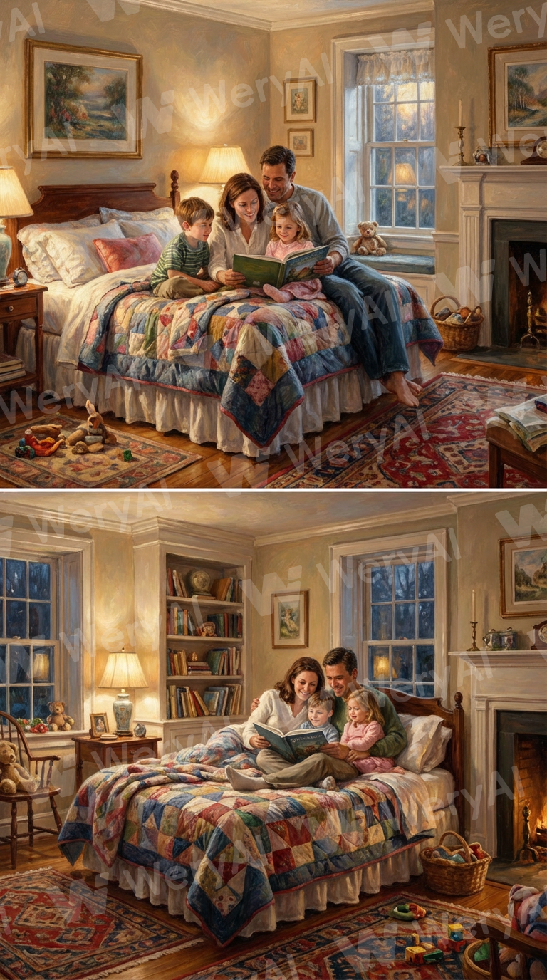 Parents reading a bedtime story to their children in a cozy bedroom, realistic painting style, soft evening light, warm colors, intricate details, natural and tender expressions