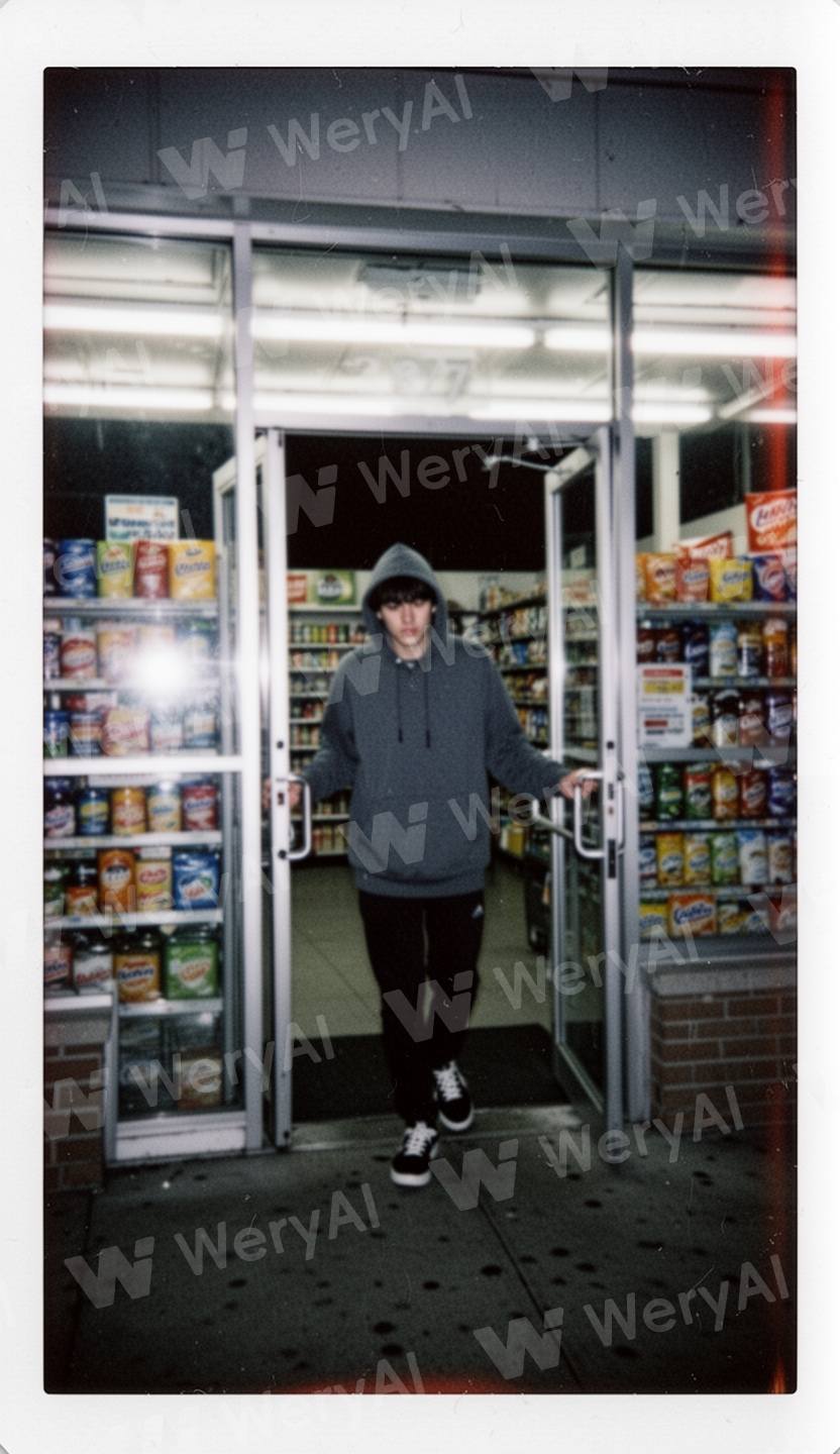 A Polaroid photo taken at the entrance of a late-night convenience store. The lighting is dim and slightly overexposed. A young person in a hoodie is pushing the door open to step out. The image has realistic grain and light leak effects.