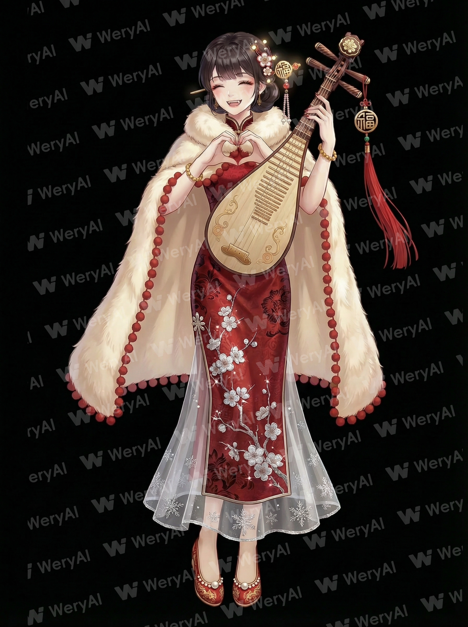 Style refers to the image only; no other references. Full-body character display. Clothing: Red cheongsam with dark patterns (silver-white plum blossoms spreading upward from the hem, petal edges with subtle shimmering), hemline spliced with translucent white gauze (embroidered with fine silver snow patterns); the shawl is made of creamy-white rex rabbit fur, with a row of small red pom-poms sewn along the edges. Accessories: Plum blossom hairpin with mini LED lights embedded in the petals (flickering in dim light), a "Fu" character ornament + long red tassels tied to the head of the pipa, small pearls on the tips of the shoes. Wearing red shoes with gold brocade • Action: Making a heart shape with both hands, grinning to reveal small canine teeth. The visuals feature rich, festive colors and soft lighting, suitable as a blessing frame for TikTok gift effects. Keep it concise, overall matching TikTok gift effects, 2D style.