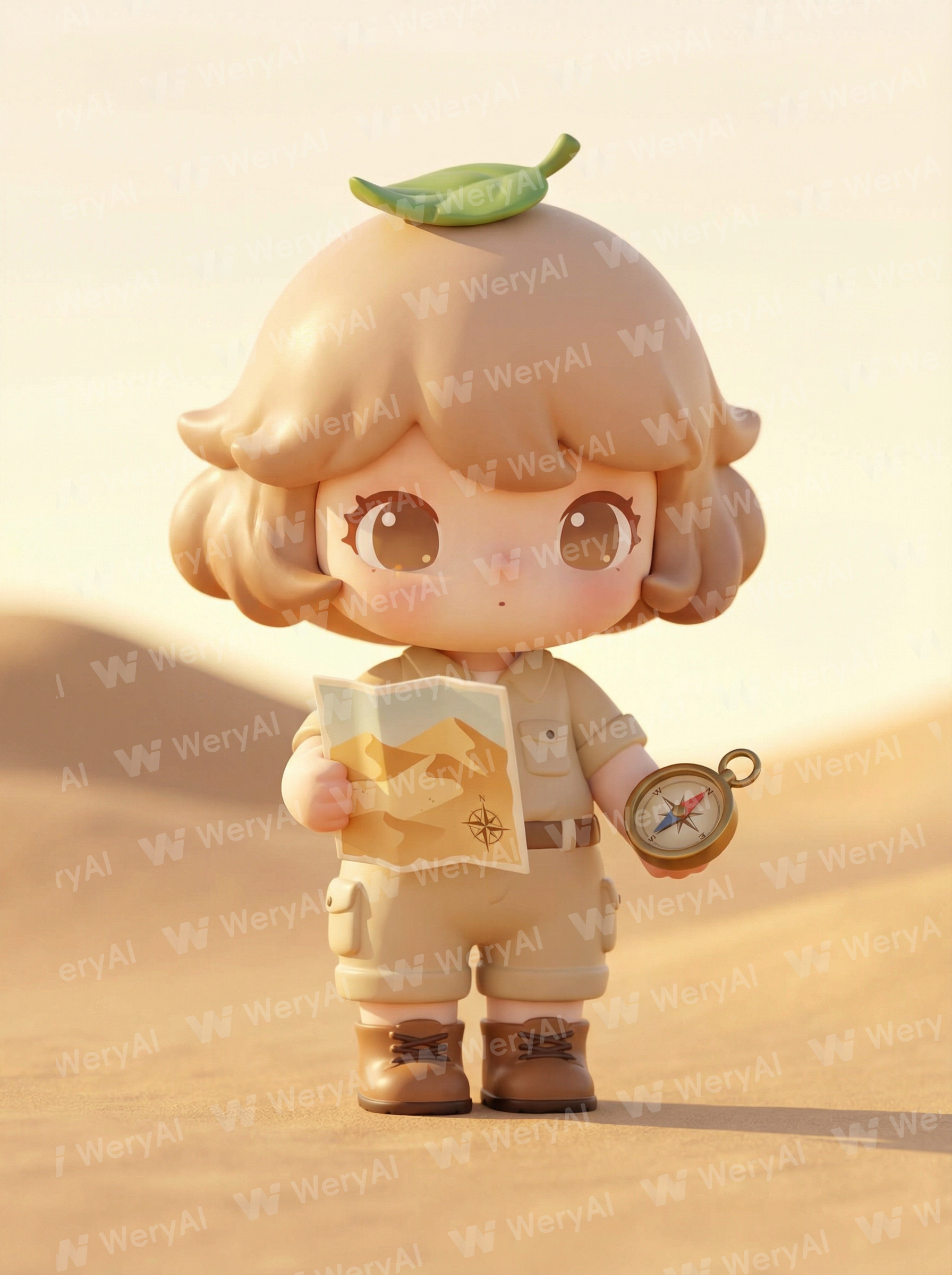 Remove the five-pointed star from Figure 6, maintain the big-head-small-body proportions, and retain the glossiness of Figure 1. Generate based on Figure 1: Desert adventure theme outfit, maintaining the character features and body proportions of Figure 1, Q-version IP. Hairstyle: Short light brown hair with a small green leaf on top (for shade). Outfit: Adventure utility overalls (jumpsuit), boots. Others: Holding a patterned map and a compass. Background: Minimalist desert. Minimalist clothing design, Octane render, fresh, warm, and cute colors, PVC material with a delicate and smooth texture, creating a healing and childlike atmosphere. Front view, full-body display, maintaining big-head-small-body proportions.