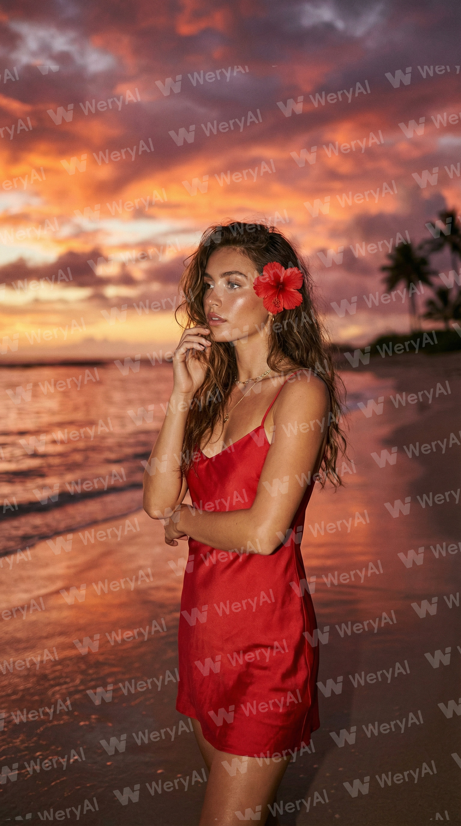 A cinematic sunset beach portrait of a young woman standing on wet sand near the shoreline, wearing a fitted red mini dress with thin straps and subtle shimmer, a red flower tucked behind her ear. She has long flowing brown hair, natural glowing skin, soft makeup, and a delicate necklace. She is posing gracefully with one hand near her ear, gazing slightly off-camera. The sky is dramatic with deep pink, orange, and purple clouds reflecting on the calm ocean. Golden hour lighting, soft flash photography look, shallow depth of field, fashion editorial style, ultra-realistic, high detail, 35mm lens, warm tones, romantic mood, clean composition.