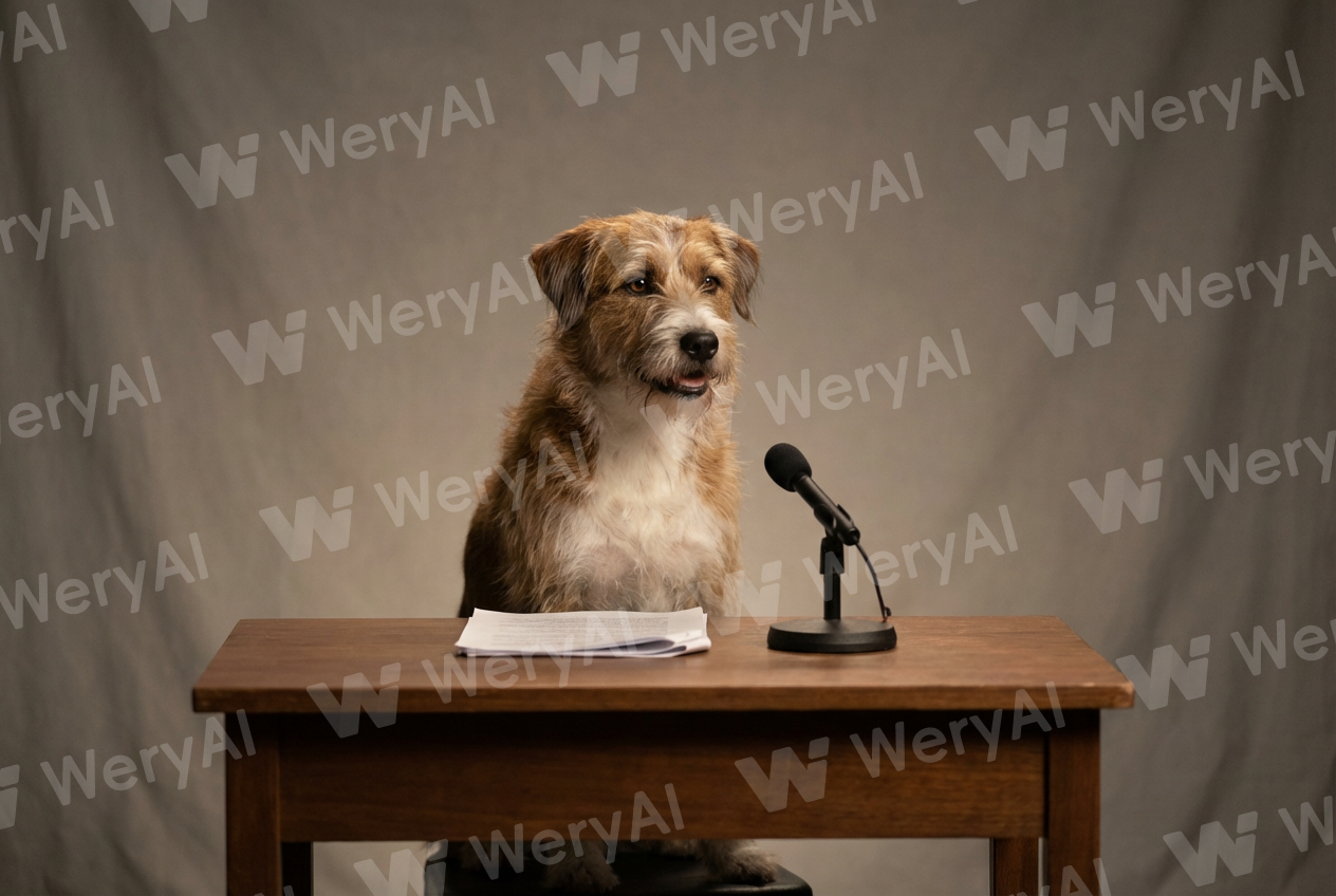 A calm, professional AI-generated dog character sitting behi...