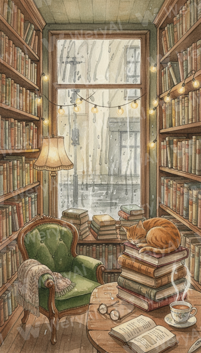 Cozy independent bookshop interior rainy day, towering wooden bookshelves filled with worn paperbacks, tabby cat curled sleeping on stack of books, steamy window with rain trails, warm lamplight, scattered reading glasses and teacup, vintage armchair in corner, cottagecore meets dark academia, watercolor soft style, Ghibli atmosphere