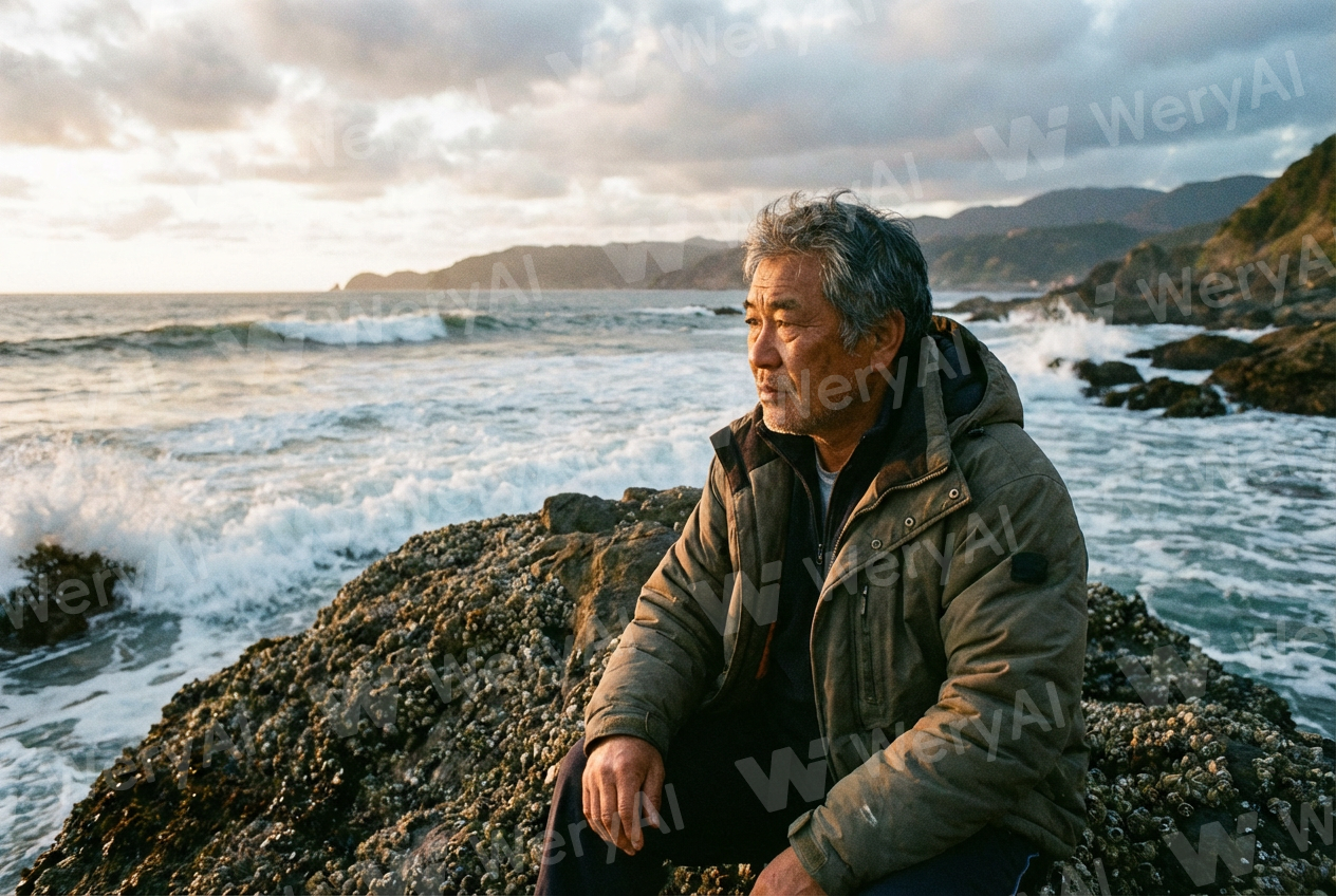 A photo of a middle-aged Asian person sitting on a rock by the sea
