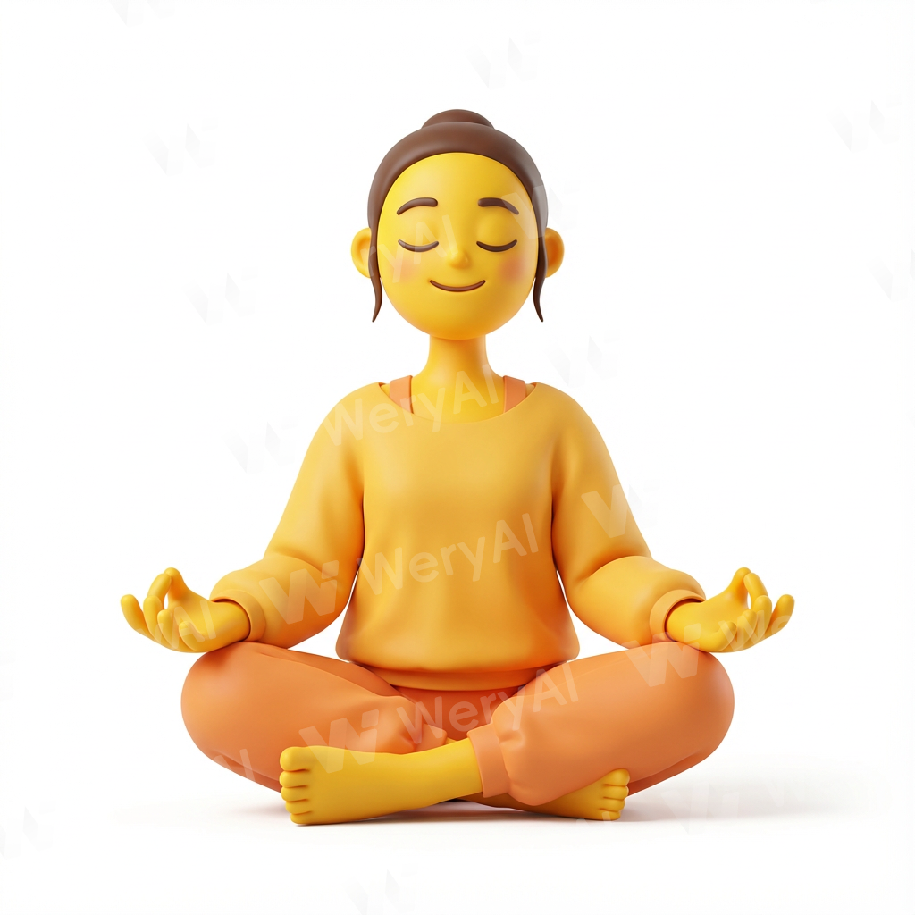 Based on the visual style of the reference image, generate for me a young woman sitting on the ground and meditating. The male character has yellow skin, and the clothing is primarily a combination of yellow (#F49C50). Pure white background.