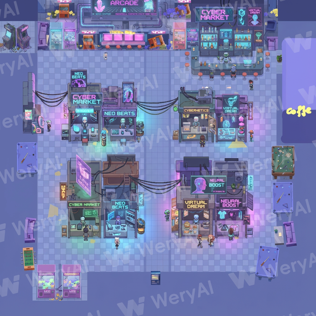 Add objects, stalls, bar counters, cyber elements, and billboards