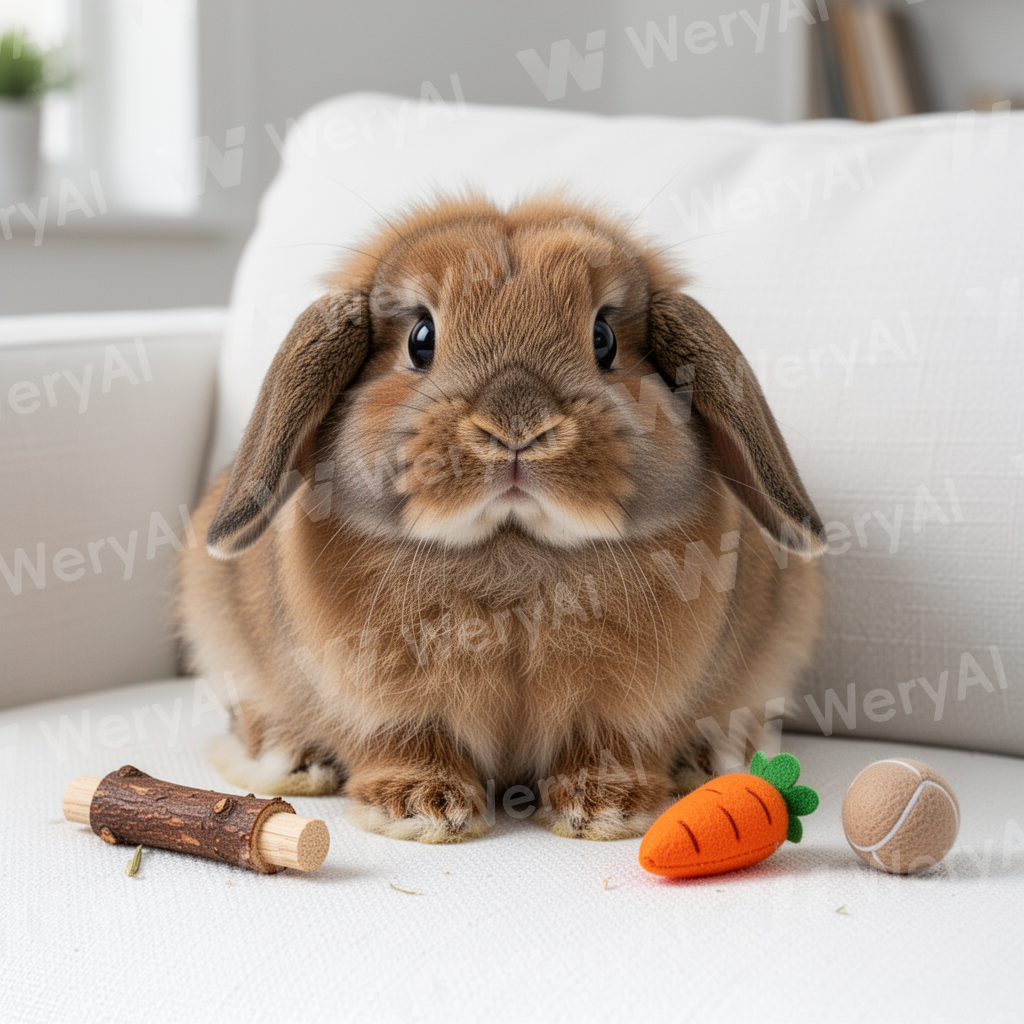 A cute, fluffy lop-eared rabbit with glossy(brown-yellow) fur, sitting on a white fabric sofa. The rabbit has large, round, jet-black eyes that look bright and lively. The fur appears soft and shiny under soft indoor lighting. Surrounding the rabbit are small pet rabbit toys: a wooden chew toy, a tiny carrot-shaped plush, and a small ball. The scene is cozy and well-lit, with a clean home background. Highly detailed, realistic texture, sharp focus, professional animal photography.