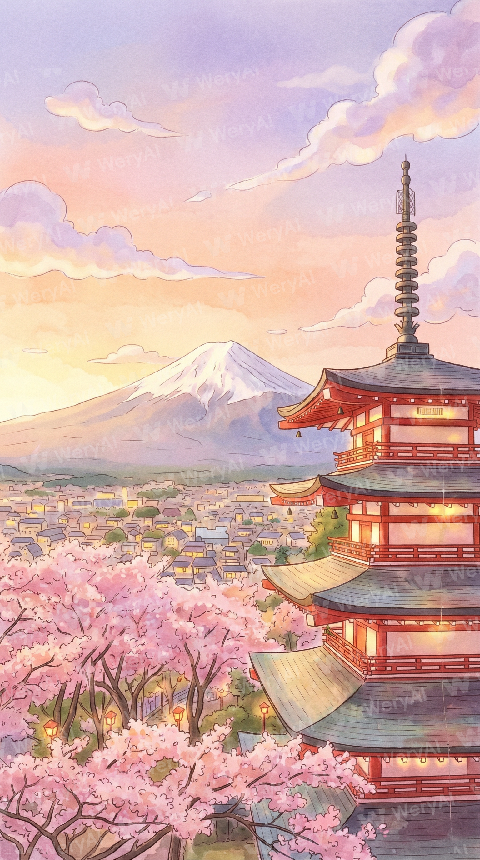 A Studio Ghibli–inspired illustration of a peaceful Japanese landscape at sunrise: a red multi-tiered pagoda in the foreground, surrounded by soft pink cherry blossom trees in full bloom, overlooking a quiet town below. In the distance, Mount Fuji rises gently with a snow-capped peak under a pastel sky. Warm, glowing light, hand-painted watercolor textures, soft outlines, whimsical and dreamy atmosphere, lush natural colors, cinematic wide shot, gentle clouds, serene and magical mood, detailed yet simple anime style, nostalgic and cozy Ghibli aesthetic.