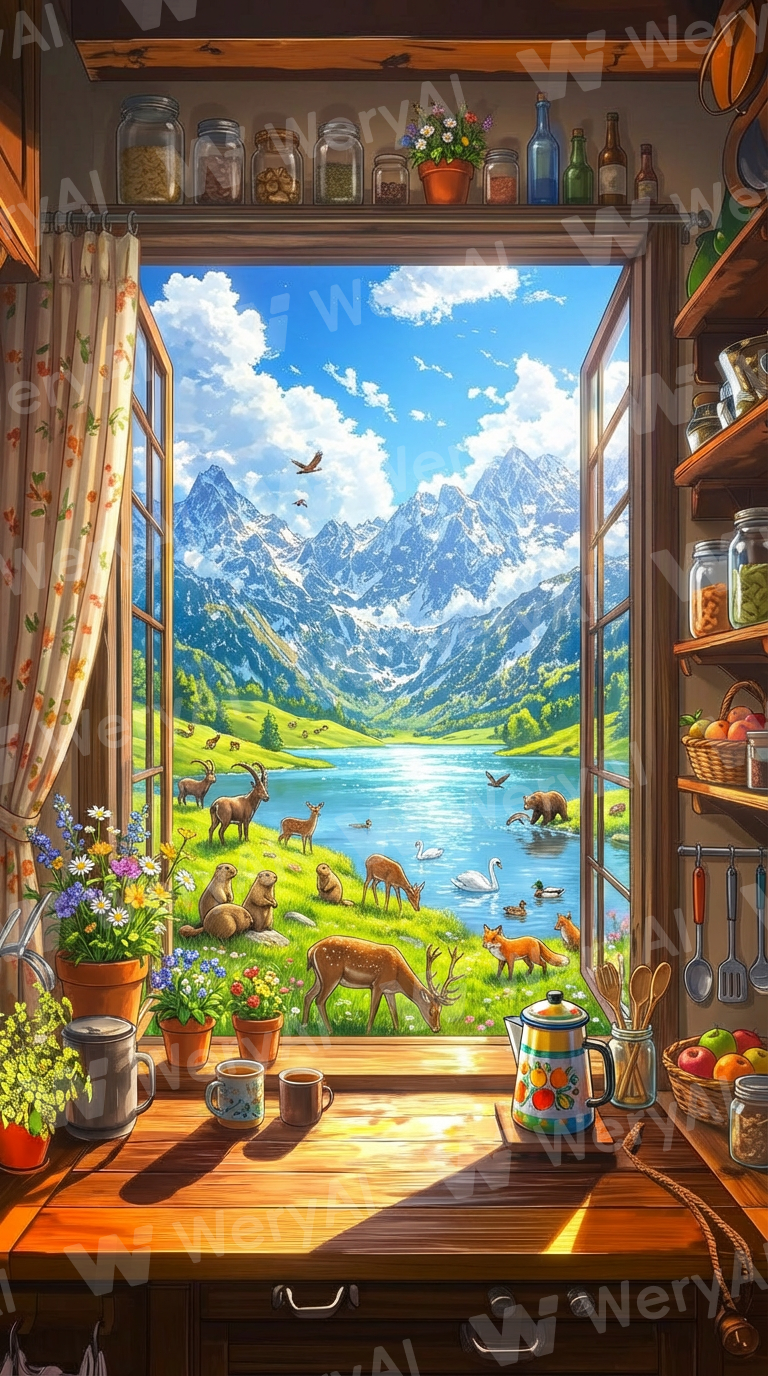 Generate a similar image with brighter colors and more brilliant sunshine, a more expansive field of view, and a wider variety of animals. The house in the image should disappear, the items on the table and shelves should be varied, and the bottles and kettles should be different.