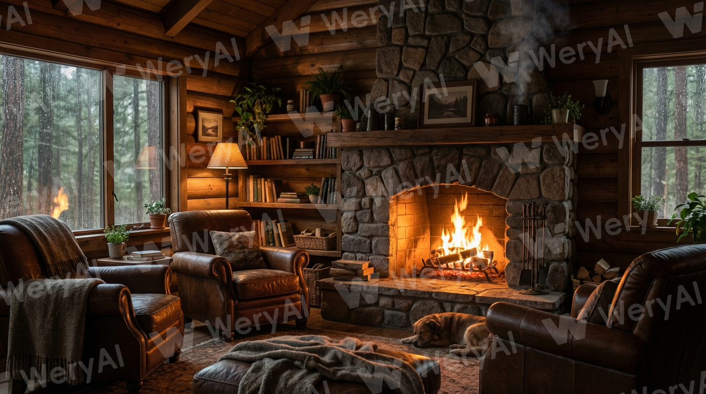 A cozy wooden cabin in the forest, inside view, warm fireplace with glowing orange flames, soft shadows, gentle smoke rising, realistic and cinematic, subtle flickering, calm cozy atmosphere, cinematic lighting.
