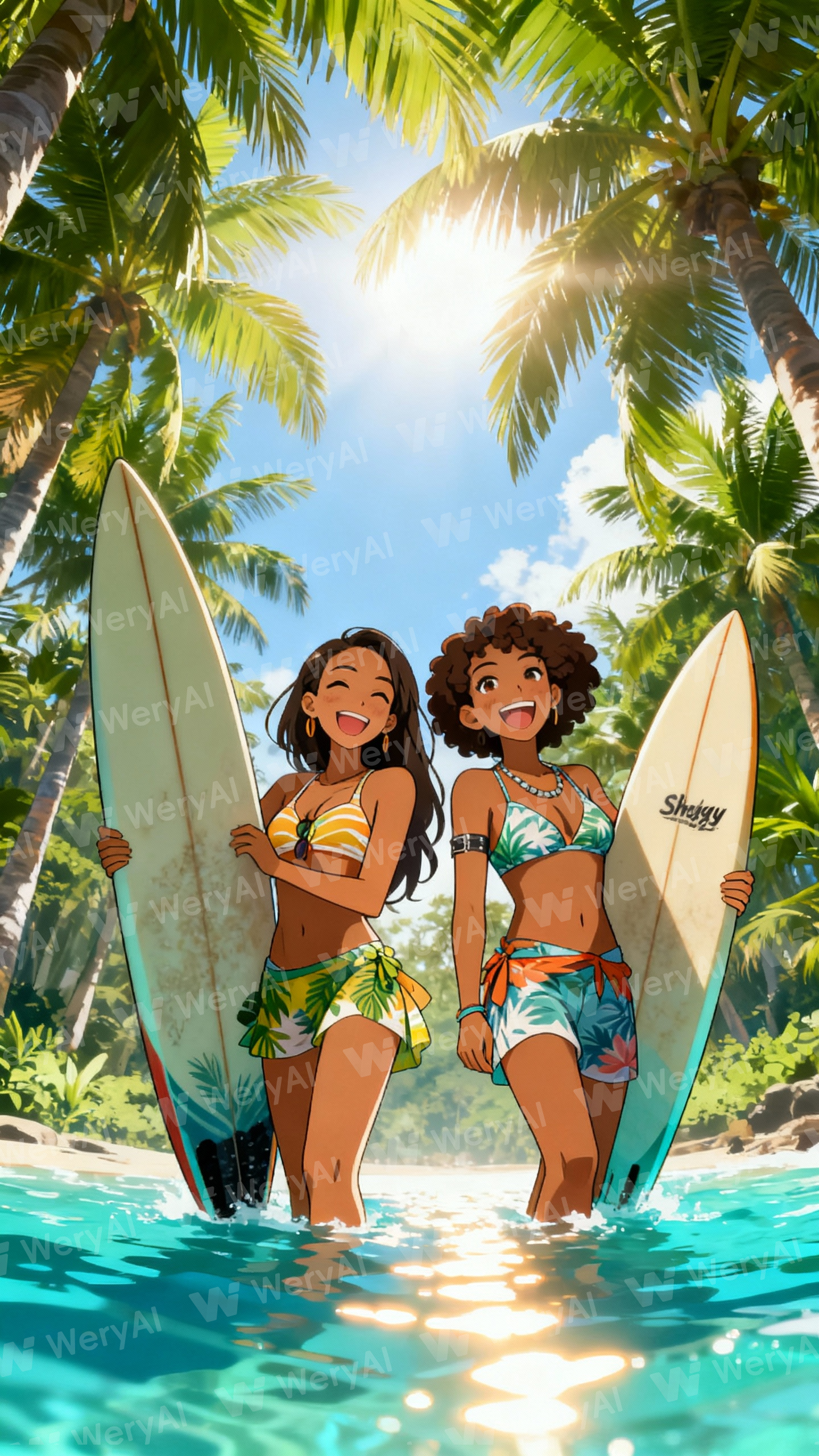 anime art style, Camila, Shaggy, two tanned-skin girls, low angle shot, candid smiles, holding surfboards, warm smiles gracing their lips, supportive and collaborative atmosphere, seeking guidance on her surfing form, tropical outfits, set against a backdrop of lush palm trees and the bright sunlight hitting the water, ultra-detailed, cinematic quality, masterpiece, best quality