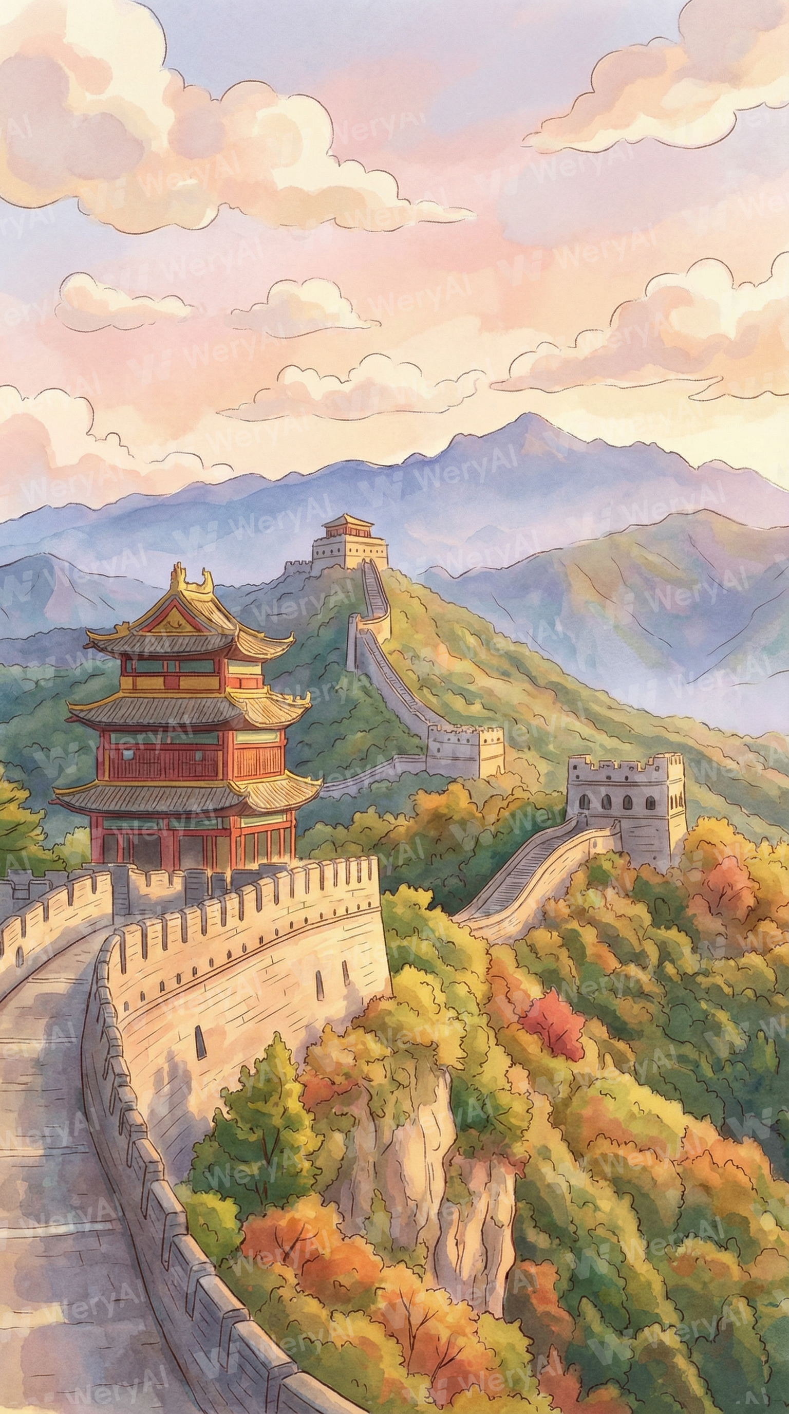 A Studio Ghibli–inspired illustration of the Great Wall winding gracefully across lush green mountains at golden hour. Ancient stone walls and watchtowers curve softly through rolling hills, surrounded by dense forests painted in warm greens and autumn tones. A traditional watchtower with red wooden accents sits peacefully along the wall. The distant mountains fade into a dreamy blue haze beneath a pastel sky with fluffy, hand-painted clouds. Soft sunlight bathes the scene in a warm glow. Whimsical, serene, and magical atmosphere with watercolor textures, gentle linework, cinematic wide view, and a sense of quiet wonder and nostalgia typical of a Ghibli landscape.