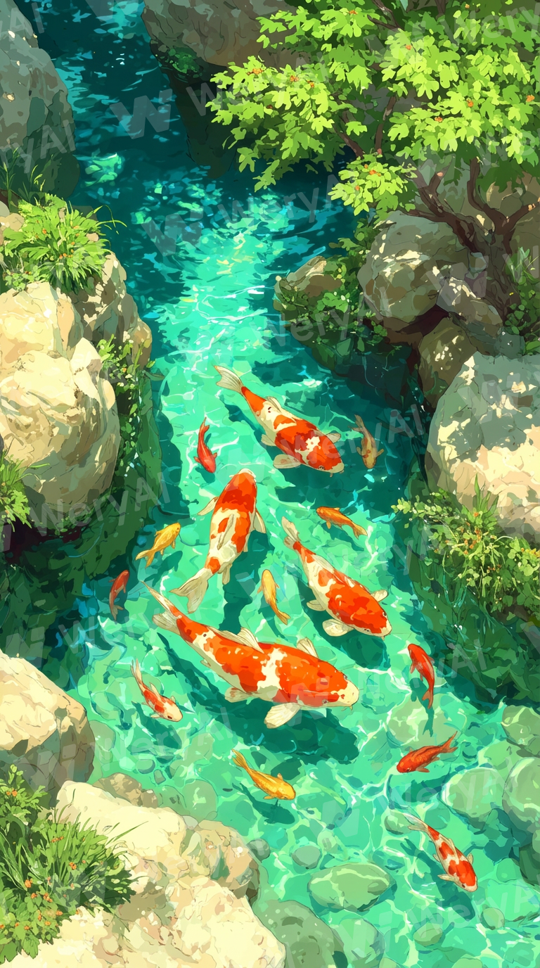 Generate a similar image with more vibrant colors, featuring both large and small goldfish in the water.